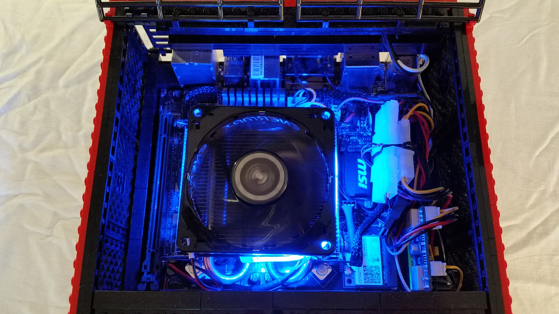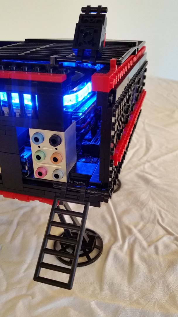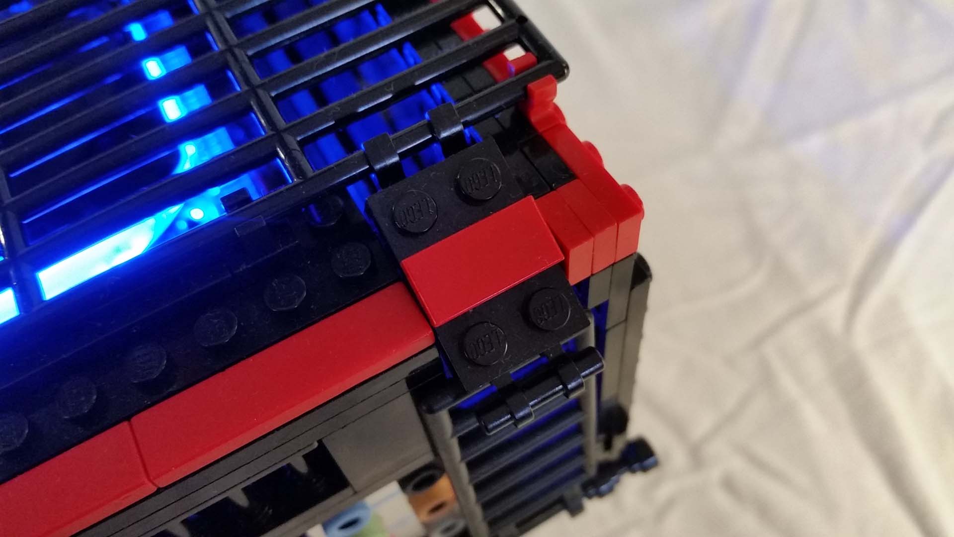 Unten am Gehäuse und um den CPU Lüfter befinden sich LED Streifen, die sich über einen Schalter, der zwischen die Stromversorgung gesetzt wurde, ausschalten lassen. Der Schalter wird über das Drücken auf einen Legostein betätigt.