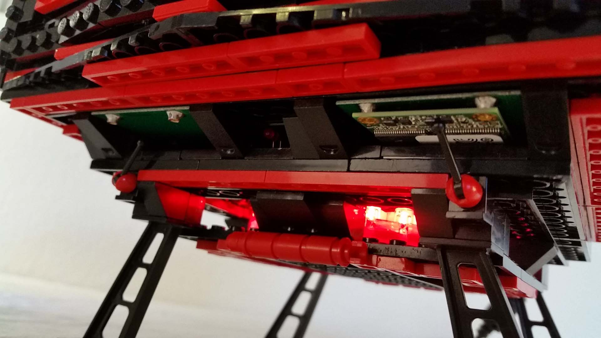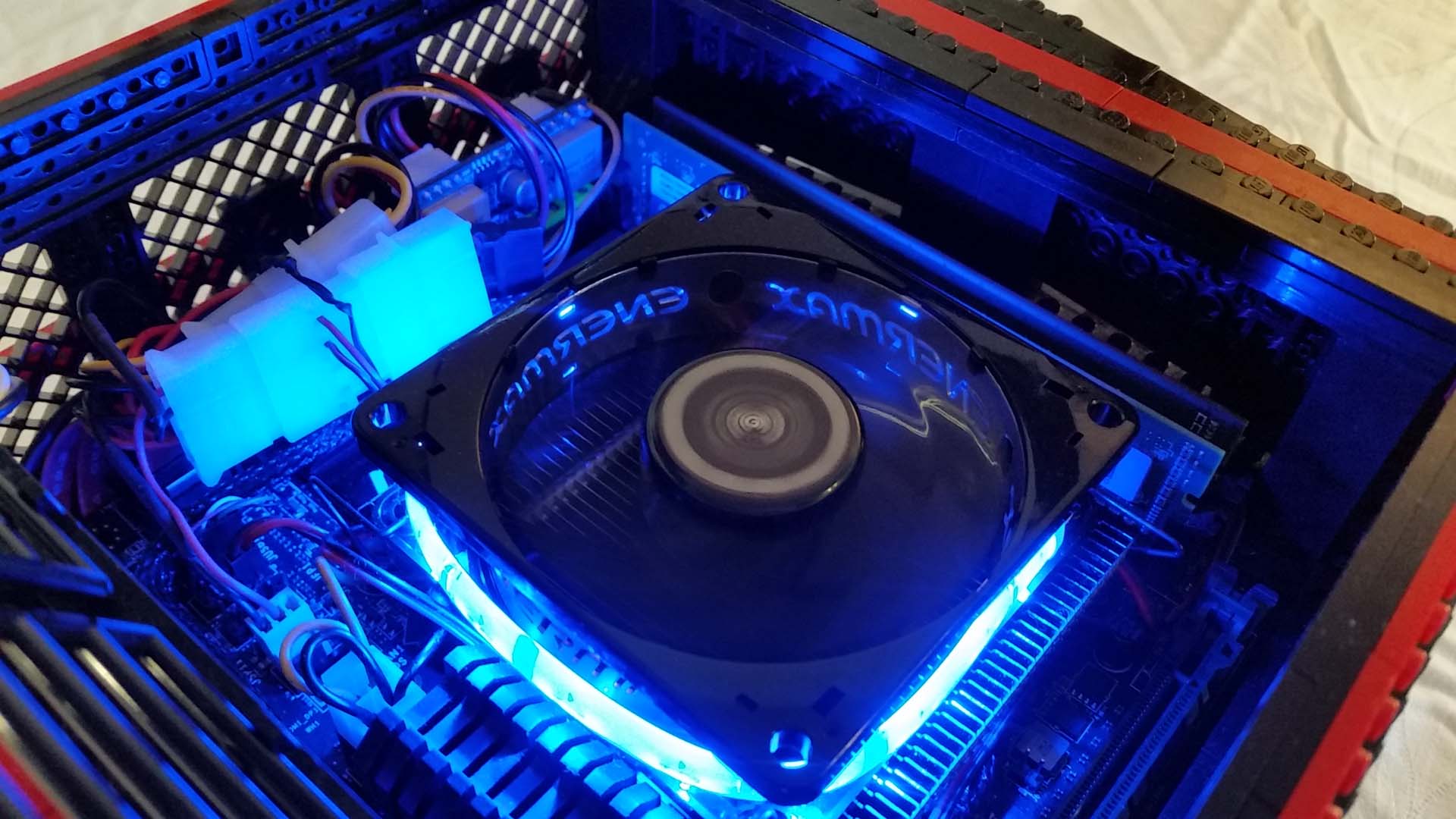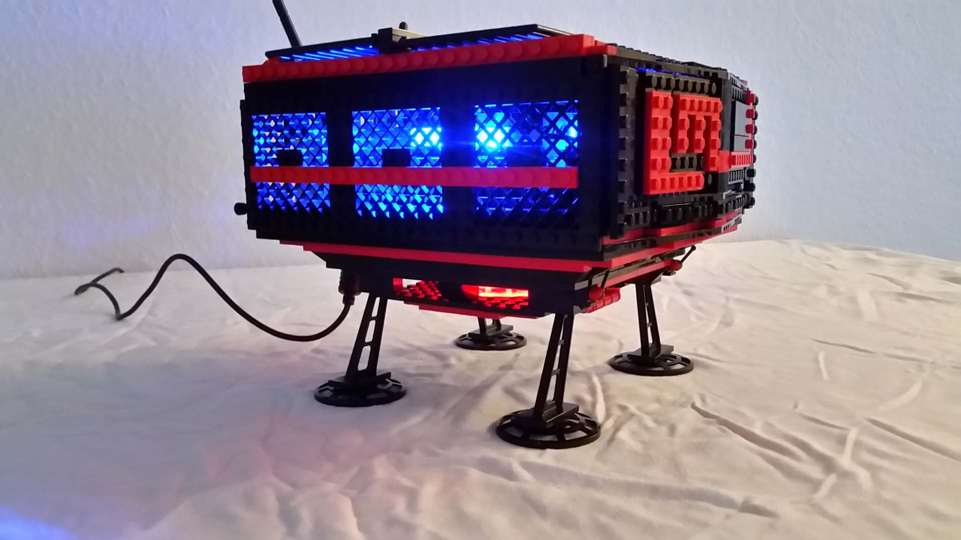 Unten am Gehäuse und um den CPU Lüfter befinden sich LED Streifen, die sich über einen Schalter, der zwischen die Stromversorgung gesetzt wurde, ausschalten lassen. Der Schalter wird über das Drücken auf einen Legostein betätigt.