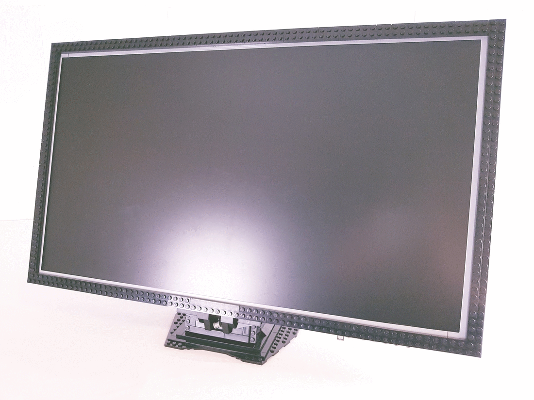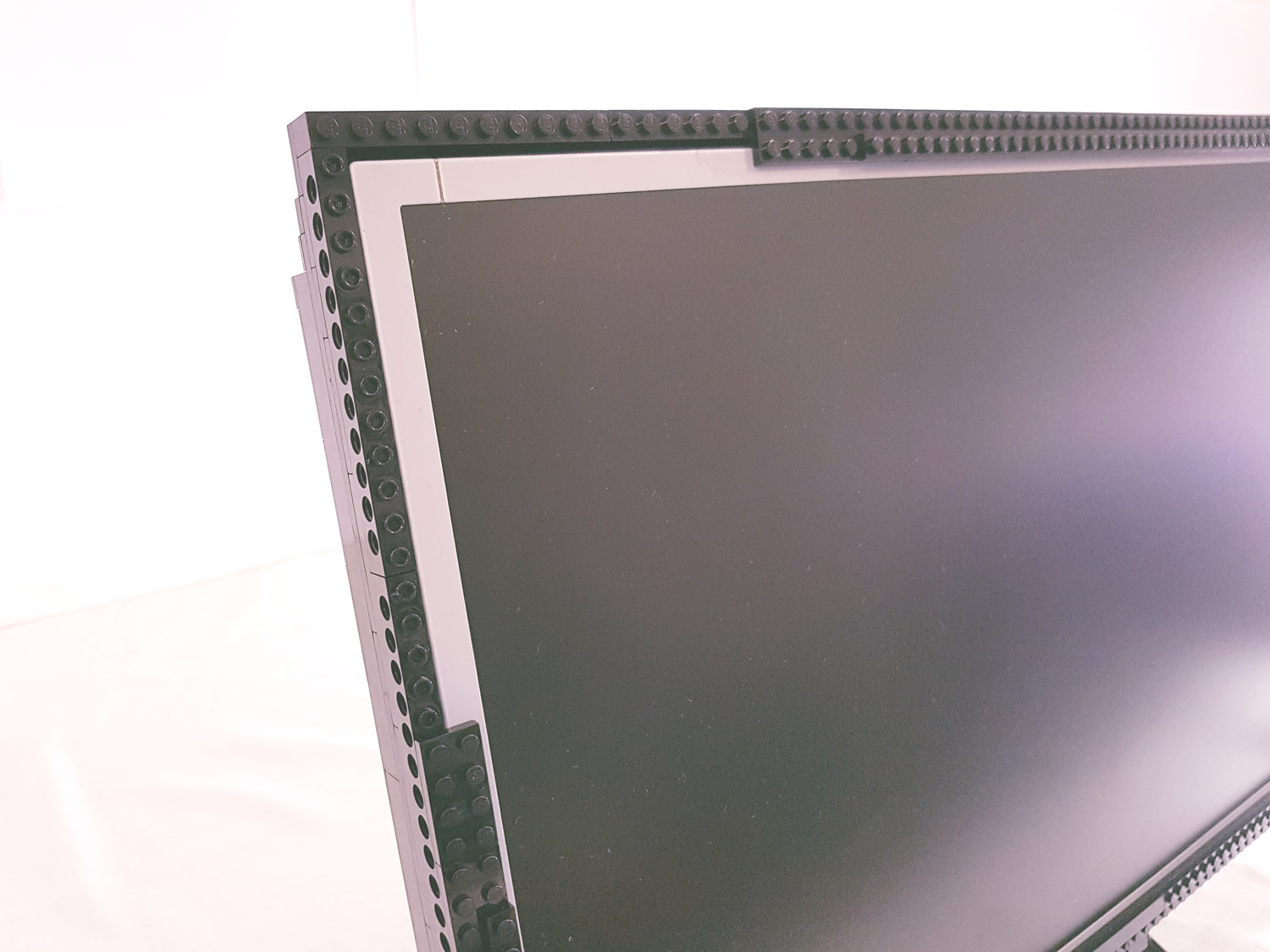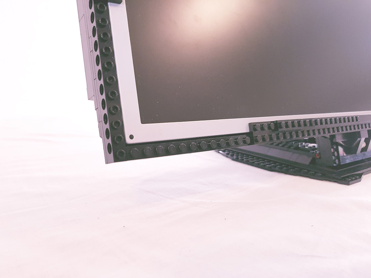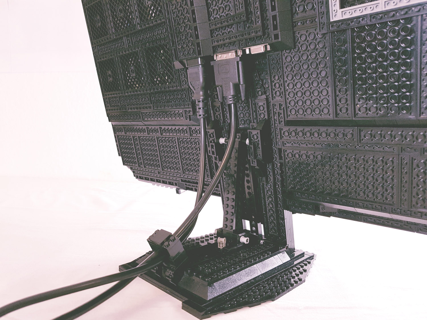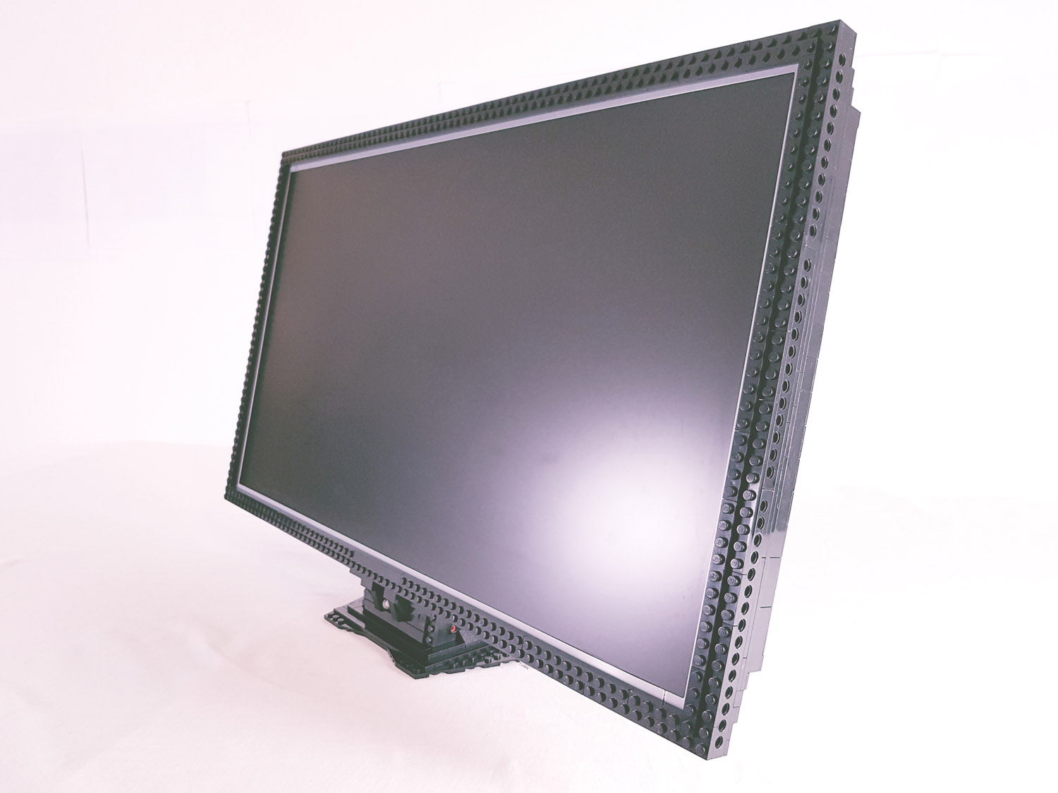LM Screen ist ein funktionierender Bildschirm in einem Gehäuse aus LEGO Steinen. Er basiert auf einem alten 24″ LCD-Monitor von Acer, dessen Kunststoffgehäuse nach einem Sturz eingerissen war. Der Bildschirm kann in Höhe und Neigungswinkel verstellt werden. Zum Verstellen der Höhe, wird er auf einer gelochten Schiene nach oben oder unten geschoben und mit einem kleinen Bolzen in seiner Position gehalten. Zum Verstellen der Neigung wird eine Stützstange auf einer, ebenfalls gelochten, horizontalen Schiene verschoben und genauso mit einem kleinen Bolzen fixiert. Die OSD-Tasten werden durch Drücken auf kleine LEGO Stangen betätigt und die Status-LED leuchtet durch einen transparenten Stein. Die Anschlüsse, die sich am originalen Bildschirm noch auf der rechten und linken Seite befanden, wurden beim LEGO Monitor in die Mitte gelegt um sie weniger auffällig, hinter dem Standfuß verlaufen zu lassen. Hinten am Standfuß ist außerdem eine Kabelführung verbaut. Um den Stromanschluss zu verlegen, wurde ein Verlängerungskabel verwendet. Durch das schwere Netzteil auf der rechten Seite, musste auf der linken Seite ein Gewicht verbaut werden, um einen gleichmäßigen horizontalen Stand des Bildschirms zu ermöglichen.