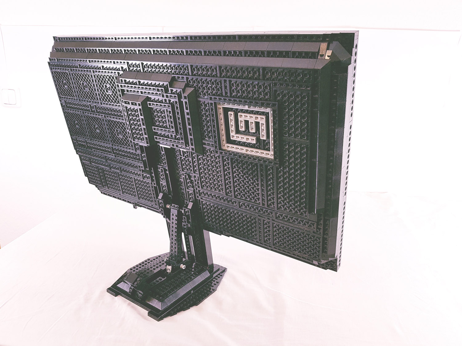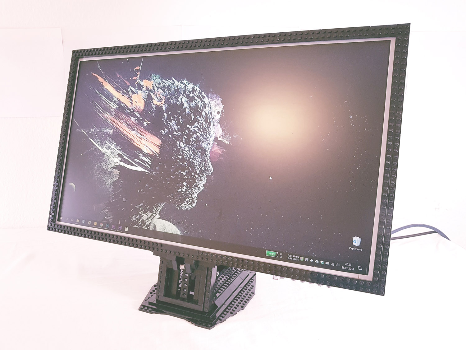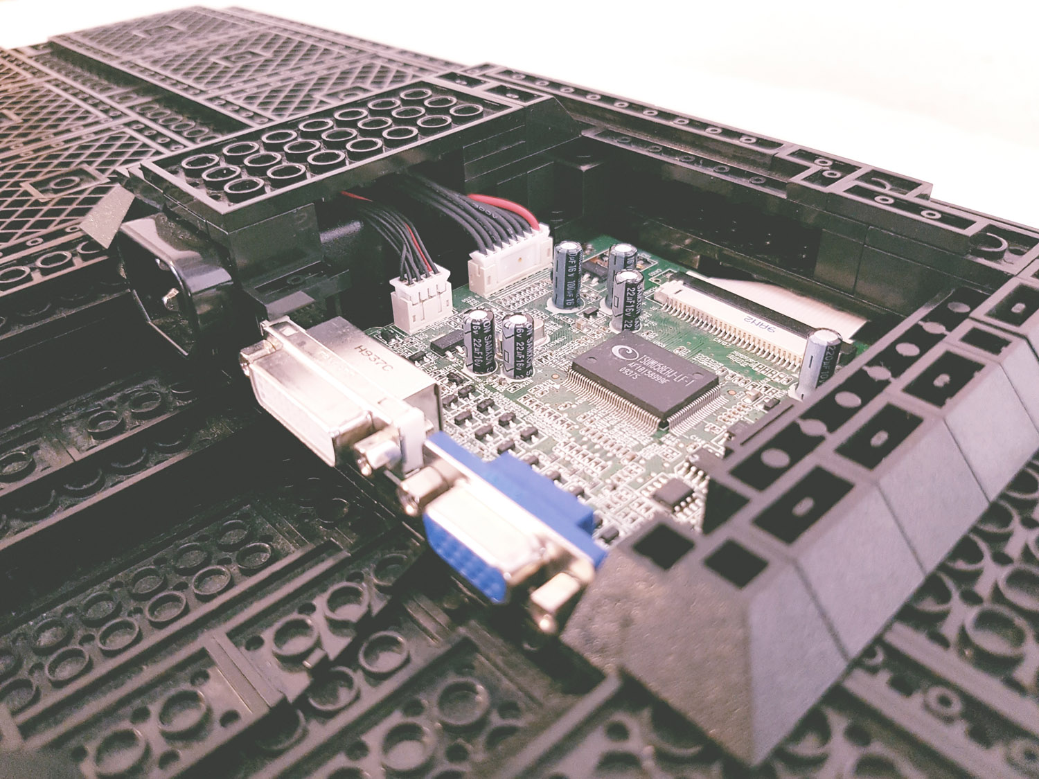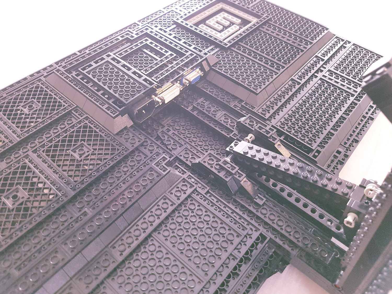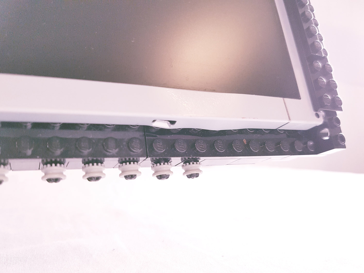 LM Screen ist ein funktionierender Bildschirm in einem Gehäuse aus LEGO Steinen. Er basiert auf einem alten 24″ LCD-Monitor von Acer, dessen Kunststoffgehäuse nach einem Sturz eingerissen war. Der Bildschirm kann in Höhe und Neigungswinkel verstellt werden. Zum Verstellen der Höhe, wird er auf einer gelochten Schiene nach oben oder unten geschoben und mit einem kleinen Bolzen in seiner Position gehalten. Zum Verstellen der Neigung wird eine Stützstange auf einer, ebenfalls gelochten, horizontalen Schiene verschoben und genauso mit einem kleinen Bolzen fixiert. Die OSD-Tasten werden durch Drücken auf kleine LEGO Stangen betätigt und die Status-LED leuchtet durch einen transparenten Stein. Die Anschlüsse, die sich am originalen Bildschirm noch auf der rechten und linken Seite befanden, wurden beim LEGO Monitor in die Mitte gelegt um sie weniger auffällig, hinter dem Standfuß verlaufen zu lassen. Hinten am Standfuß ist außerdem eine Kabelführung verbaut. Um den Stromanschluss zu verlegen, wurde ein Verlängerungskabel verwendet. Durch das schwere Netzteil auf der rechten Seite, musste auf der linken Seite ein Gewicht verbaut werden, um einen gleichmäßigen horizontalen Stand des Bildschirms zu ermöglichen.