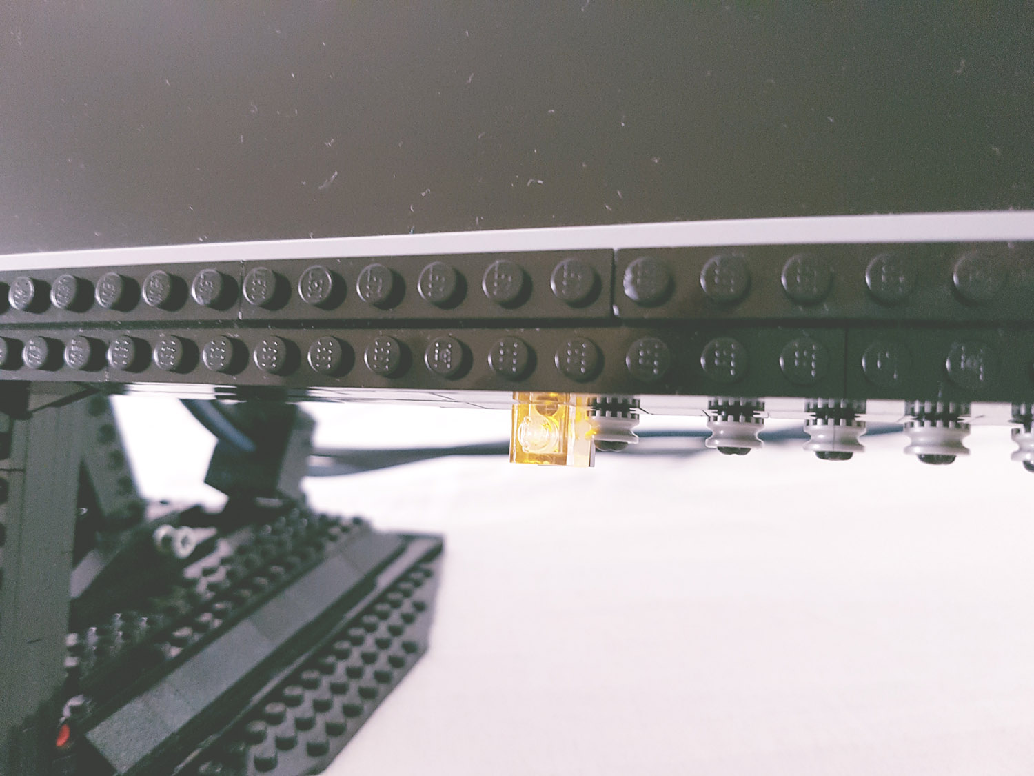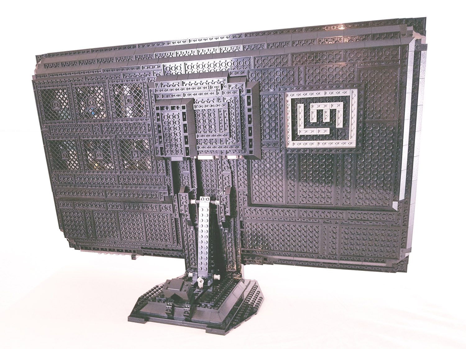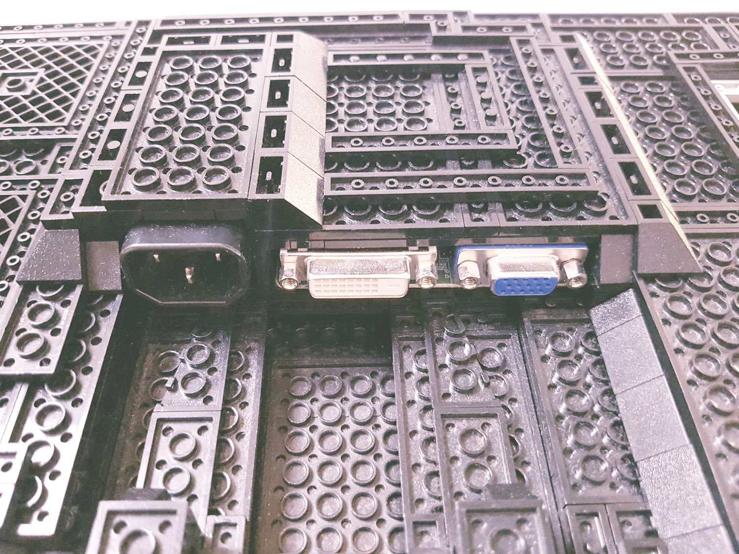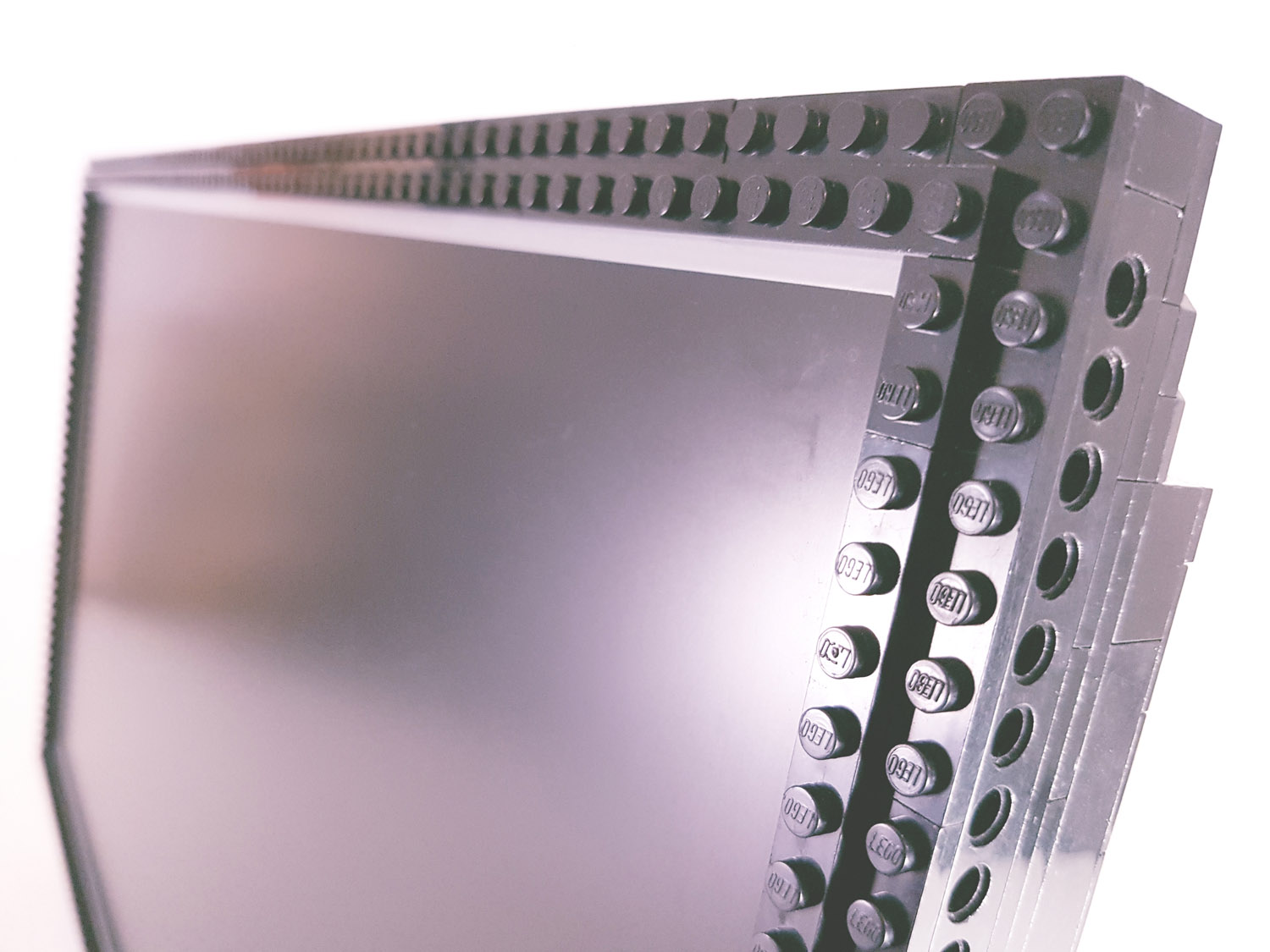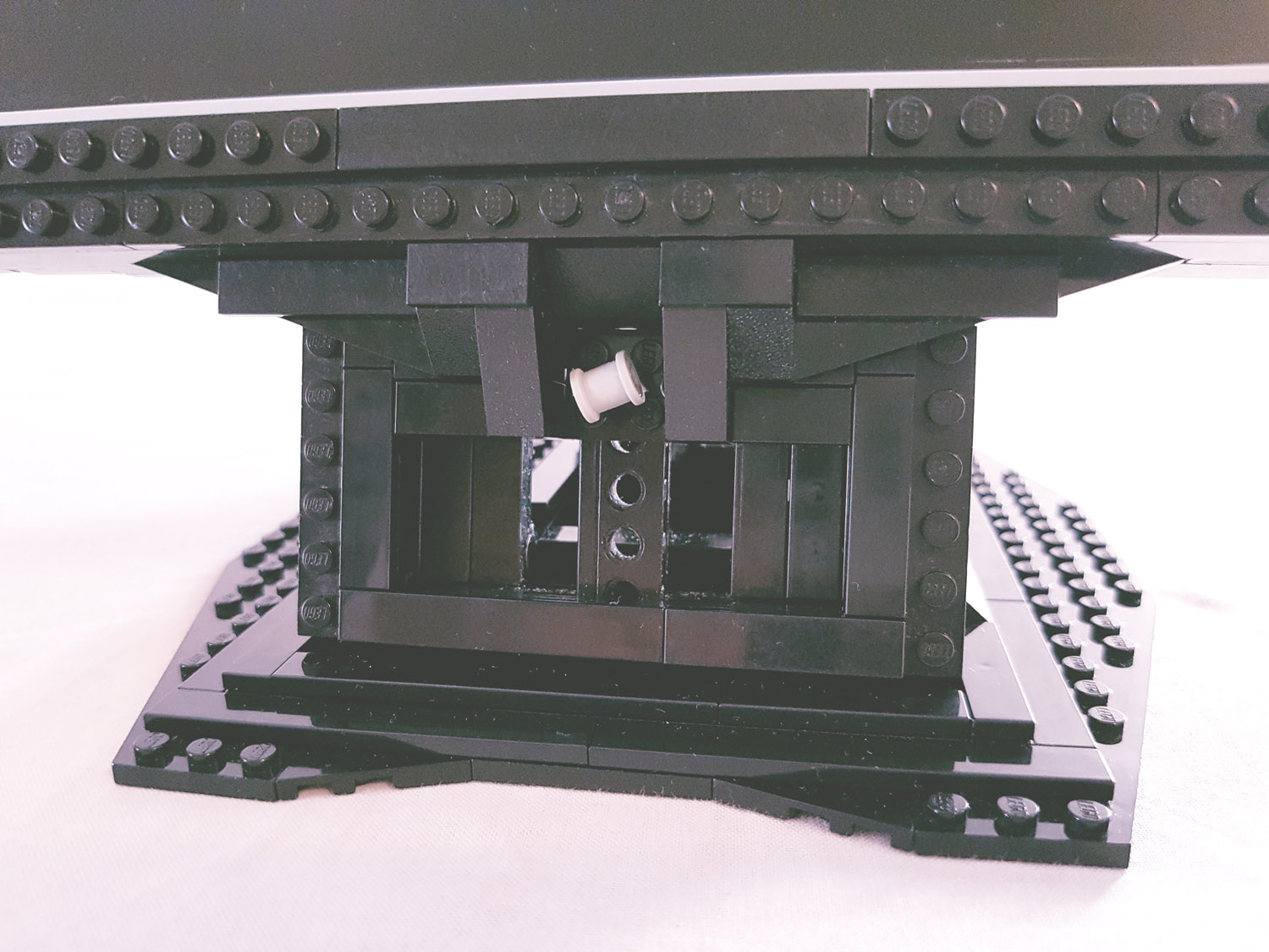 LM Screen ist ein funktionierender Bildschirm in einem Gehäuse aus LEGO Steinen. Er basiert auf einem alten 24″ LCD-Monitor von Acer, dessen Kunststoffgehäuse nach einem Sturz eingerissen war. Der Bildschirm kann in Höhe und Neigungswinkel verstellt werden. Zum Verstellen der Höhe, wird er auf einer gelochten Schiene nach oben oder unten geschoben und mit einem kleinen Bolzen in seiner Position gehalten. Zum Verstellen der Neigung wird eine Stützstange auf einer, ebenfalls gelochten, horizontalen Schiene verschoben und genauso mit einem kleinen Bolzen fixiert. Die OSD-Tasten werden durch Drücken auf kleine LEGO Stangen betätigt und die Status-LED leuchtet durch einen transparenten Stein. Die Anschlüsse, die sich am originalen Bildschirm noch auf der rechten und linken Seite befanden, wurden beim LEGO Monitor in die Mitte gelegt um sie weniger auffällig, hinter dem Standfuß verlaufen zu lassen. Hinten am Standfuß ist außerdem eine Kabelführung verbaut. Um den Stromanschluss zu verlegen, wurde ein Verlängerungskabel verwendet. Durch das schwere Netzteil auf der rechten Seite, musste auf der linken Seite ein Gewicht verbaut werden, um einen gleichmäßigen horizontalen Stand des Bildschirms zu ermöglichen.