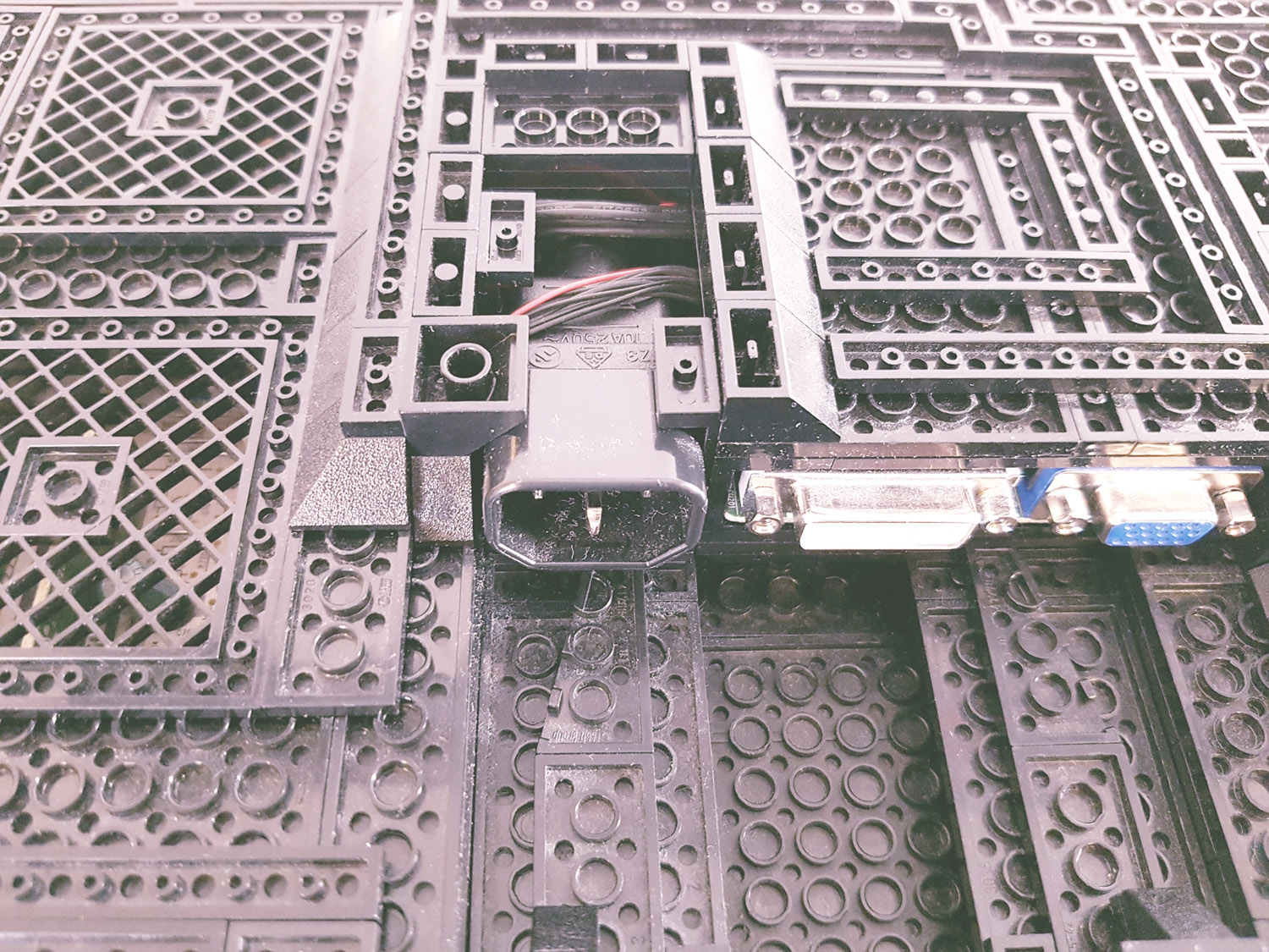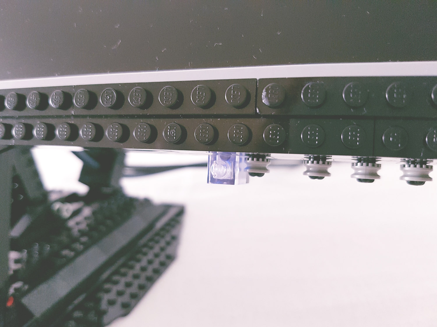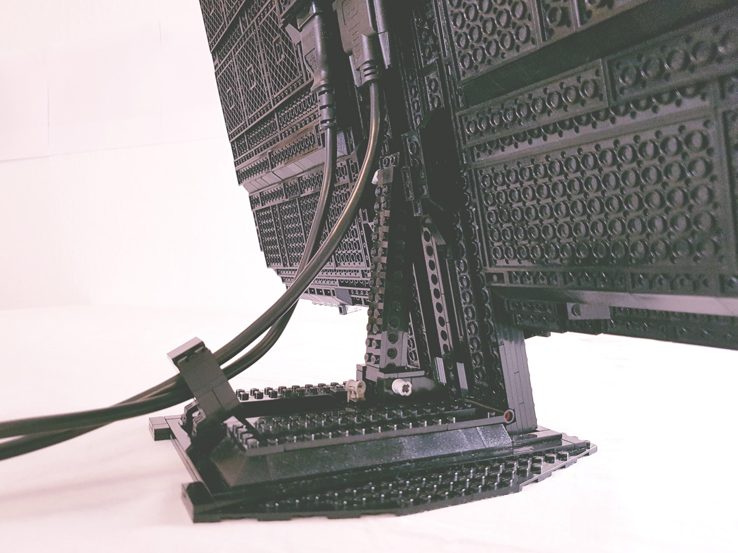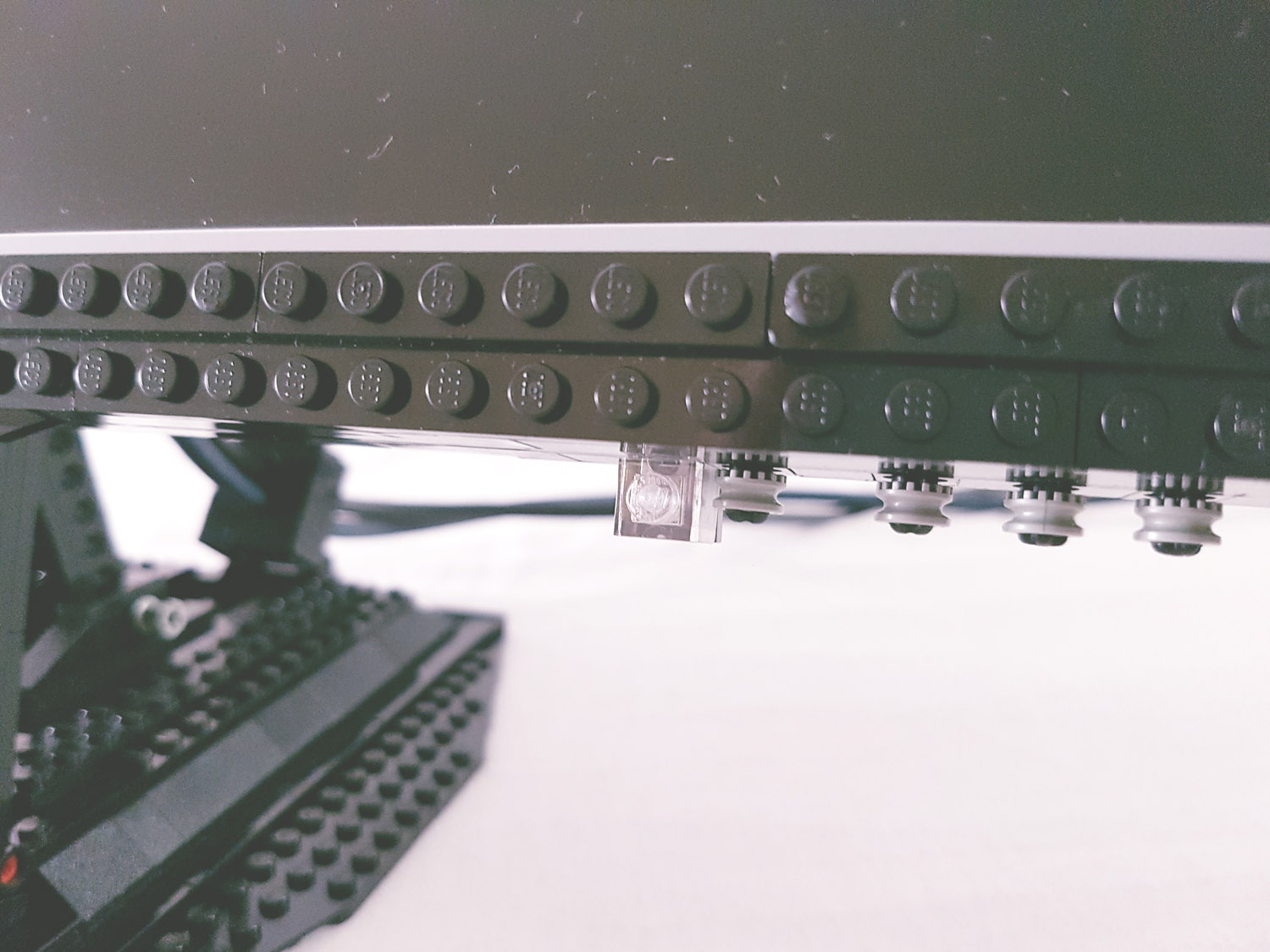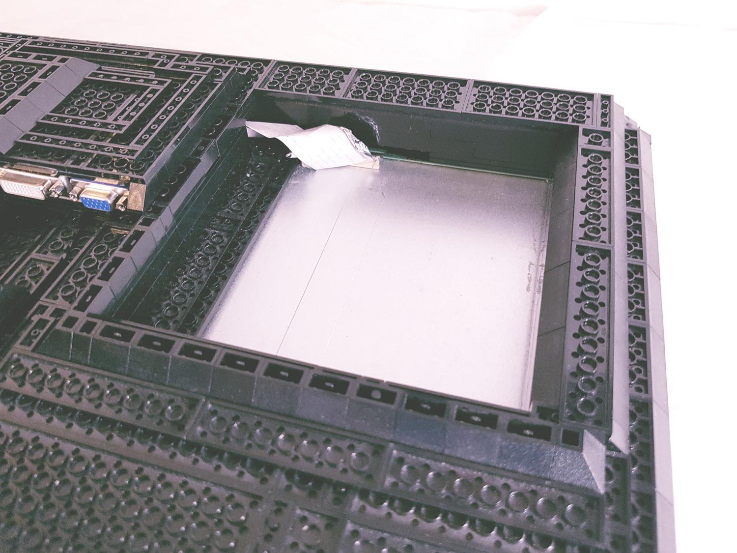 LM Screen ist ein funktionierender Bildschirm in einem Gehäuse aus LEGO Steinen. Er basiert auf einem alten 24″ LCD-Monitor von Acer, dessen Kunststoffgehäuse nach einem Sturz eingerissen war. Der Bildschirm kann in Höhe und Neigungswinkel verstellt werden. Zum Verstellen der Höhe, wird er auf einer gelochten Schiene nach oben oder unten geschoben und mit einem kleinen Bolzen in seiner Position gehalten. Zum Verstellen der Neigung wird eine Stützstange auf einer, ebenfalls gelochten, horizontalen Schiene verschoben und genauso mit einem kleinen Bolzen fixiert. Die OSD-Tasten werden durch Drücken auf kleine LEGO Stangen betätigt und die Status-LED leuchtet durch einen transparenten Stein. Die Anschlüsse, die sich am originalen Bildschirm noch auf der rechten und linken Seite befanden, wurden beim LEGO Monitor in die Mitte gelegt um sie weniger auffällig, hinter dem Standfuß verlaufen zu lassen. Hinten am Standfuß ist außerdem eine Kabelführung verbaut. Um den Stromanschluss zu verlegen, wurde ein Verlängerungskabel verwendet. Durch das schwere Netzteil auf der rechten Seite, musste auf der linken Seite ein Gewicht verbaut werden, um einen gleichmäßigen horizontalen Stand des Bildschirms zu ermöglichen.