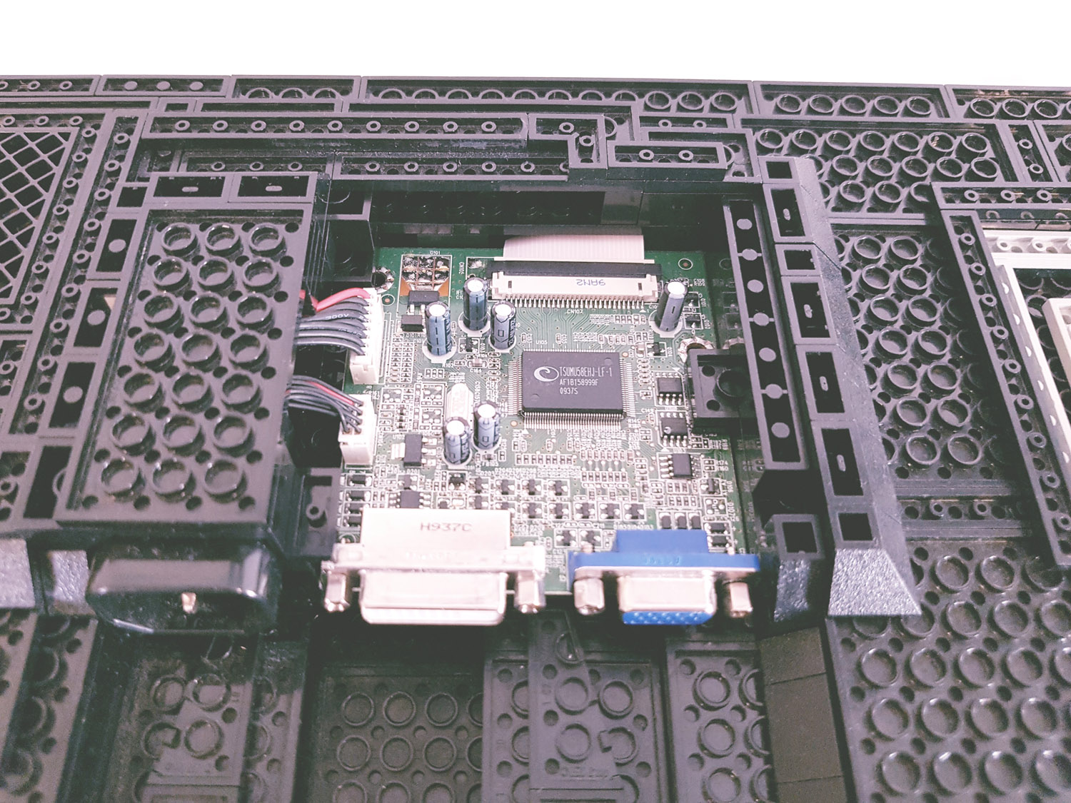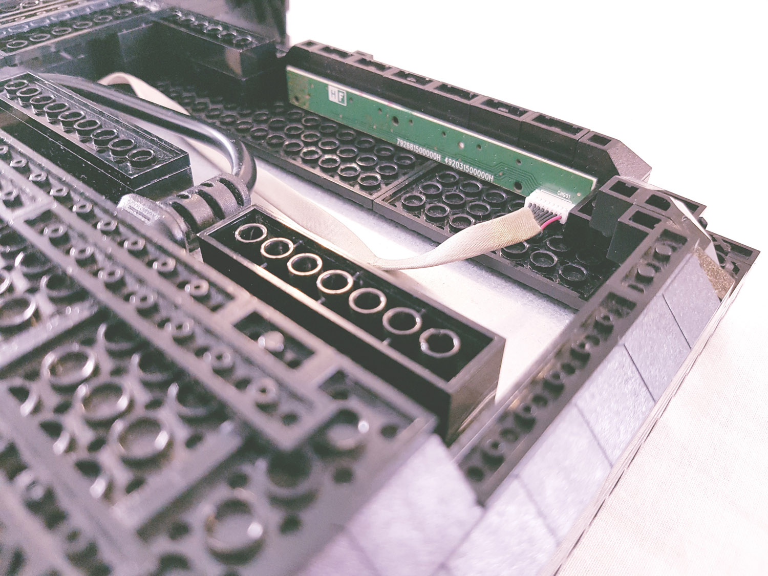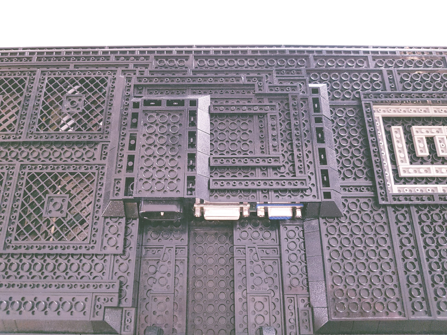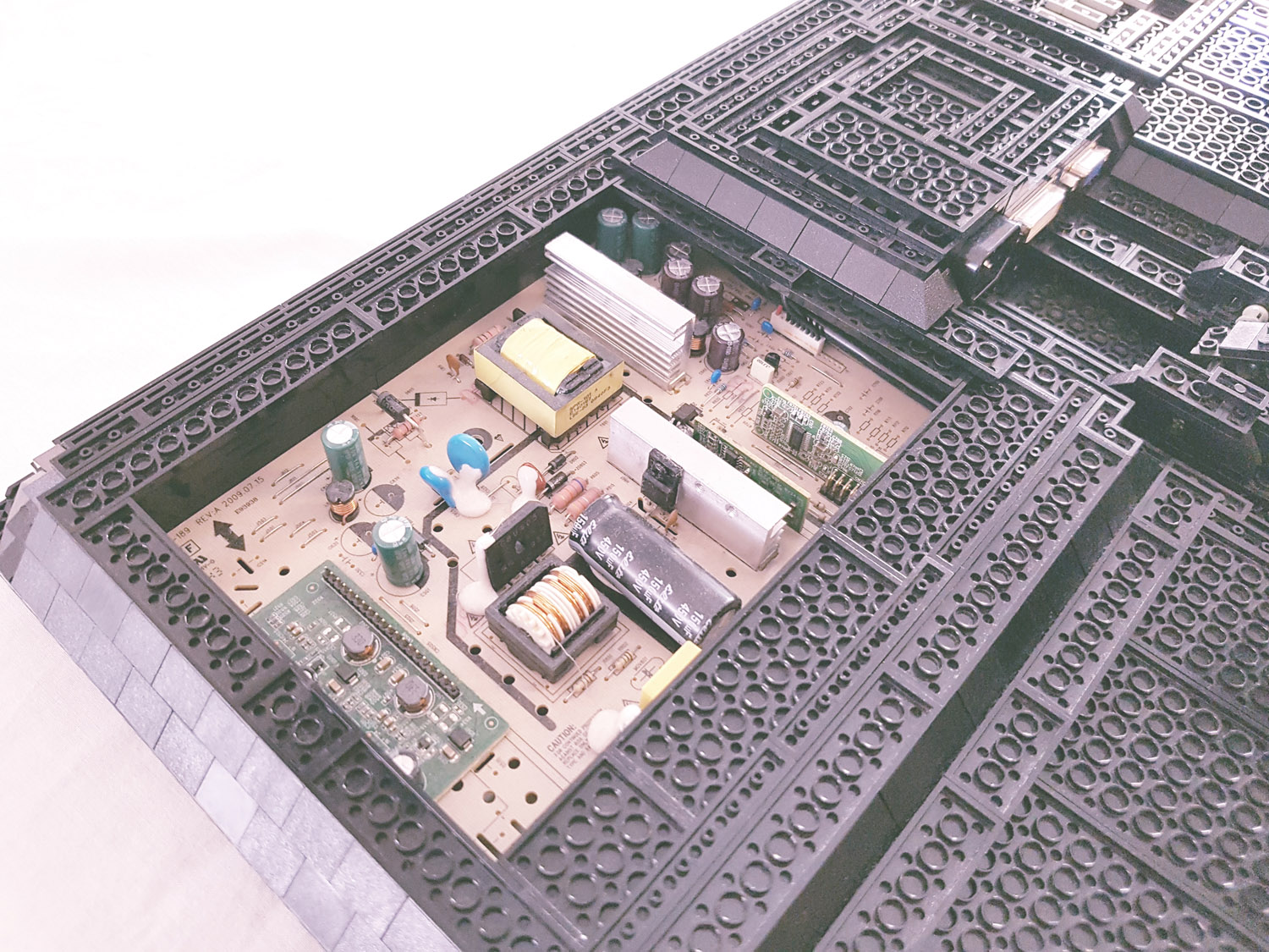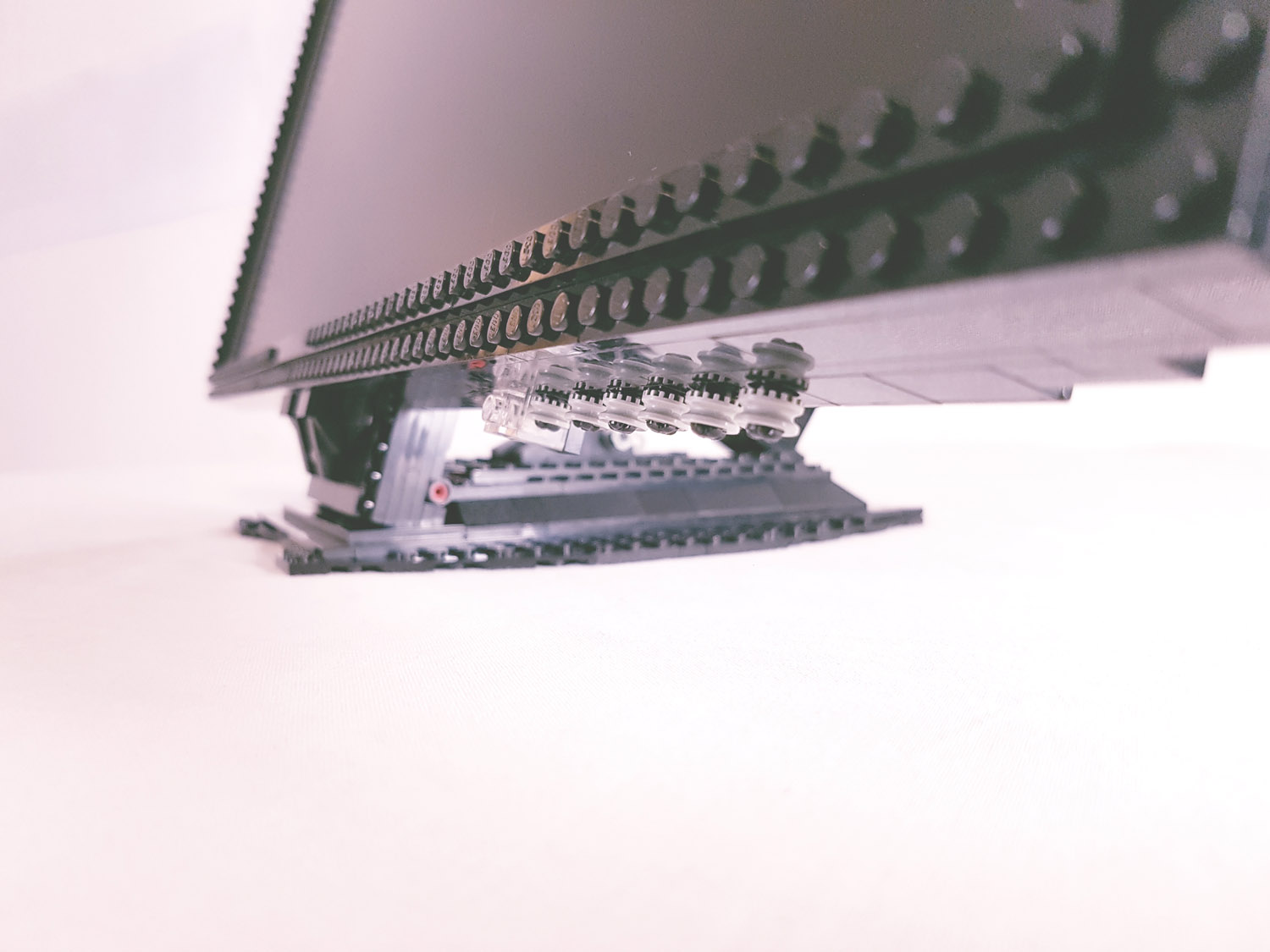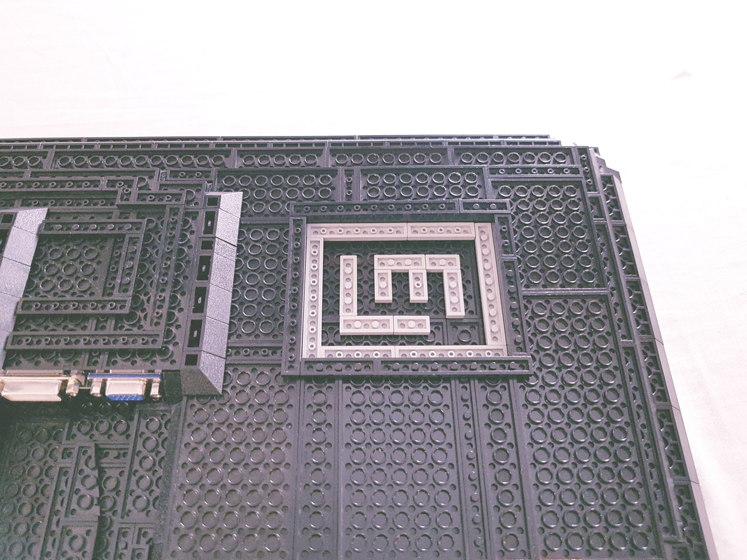 LM Screen ist ein funktionierender Bildschirm in einem Gehäuse aus LEGO Steinen. Er basiert auf einem alten 24″ LCD-Monitor von Acer, dessen Kunststoffgehäuse nach einem Sturz eingerissen war. Der Bildschirm kann in Höhe und Neigungswinkel verstellt werden. Zum Verstellen der Höhe, wird er auf einer gelochten Schiene nach oben oder unten geschoben und mit einem kleinen Bolzen in seiner Position gehalten. Zum Verstellen der Neigung wird eine Stützstange auf einer, ebenfalls gelochten, horizontalen Schiene verschoben und genauso mit einem kleinen Bolzen fixiert. Die OSD-Tasten werden durch Drücken auf kleine LEGO Stangen betätigt und die Status-LED leuchtet durch einen transparenten Stein. Die Anschlüsse, die sich am originalen Bildschirm noch auf der rechten und linken Seite befanden, wurden beim LEGO Monitor in die Mitte gelegt um sie weniger auffällig, hinter dem Standfuß verlaufen zu lassen. Hinten am Standfuß ist außerdem eine Kabelführung verbaut. Um den Stromanschluss zu verlegen, wurde ein Verlängerungskabel verwendet. Durch das schwere Netzteil auf der rechten Seite, musste auf der linken Seite ein Gewicht verbaut werden, um einen gleichmäßigen horizontalen Stand des Bildschirms zu ermöglichen.