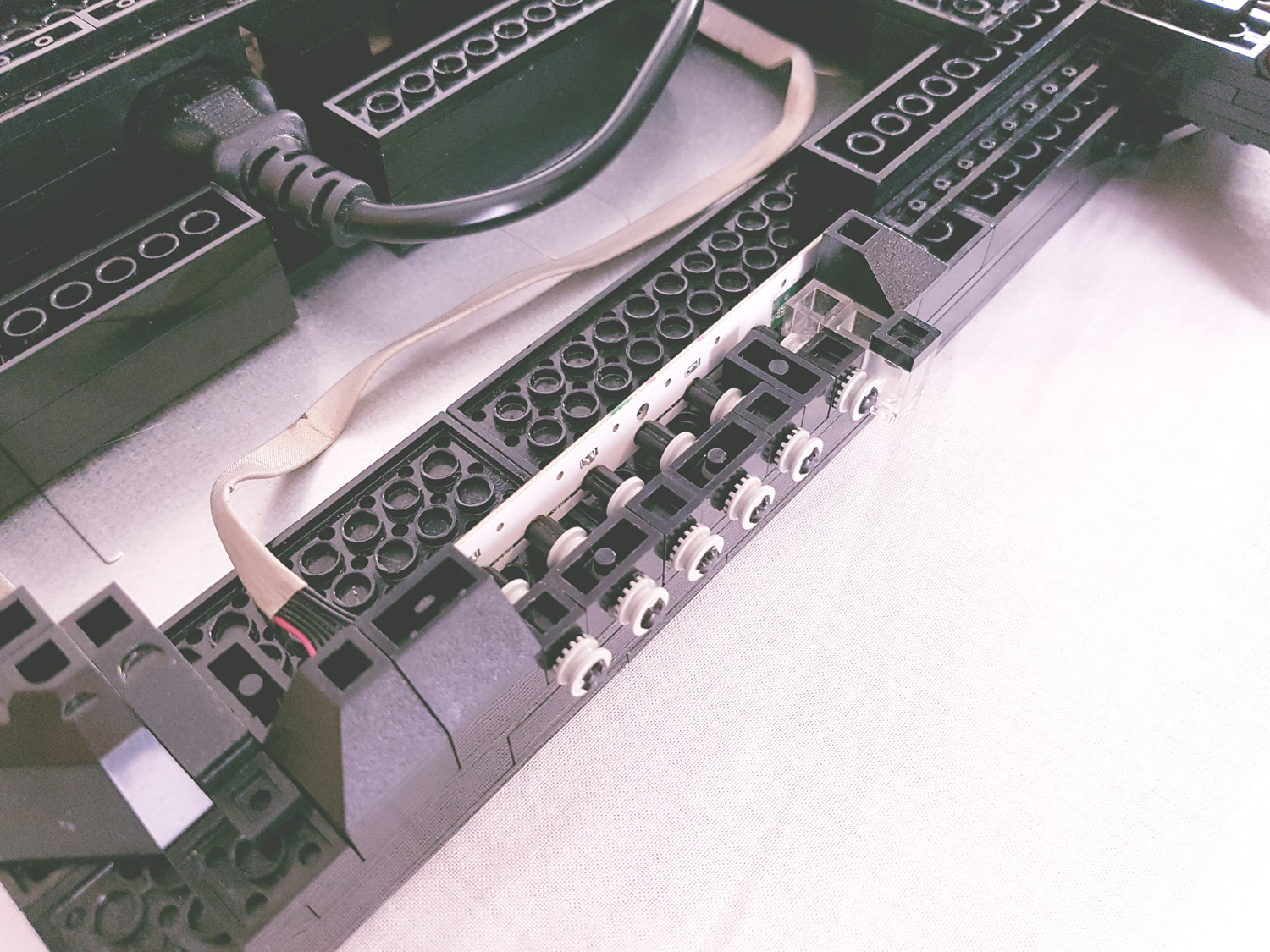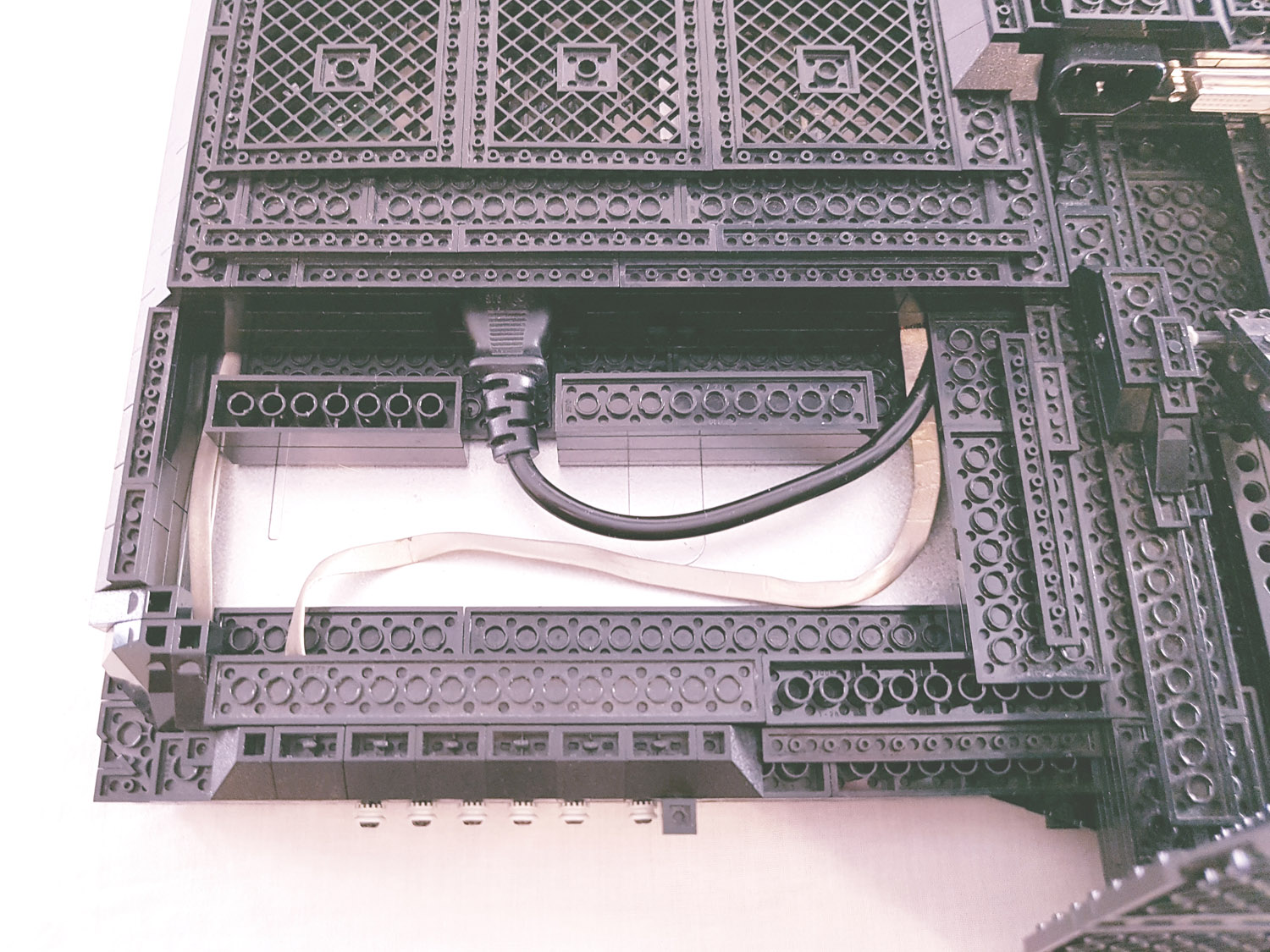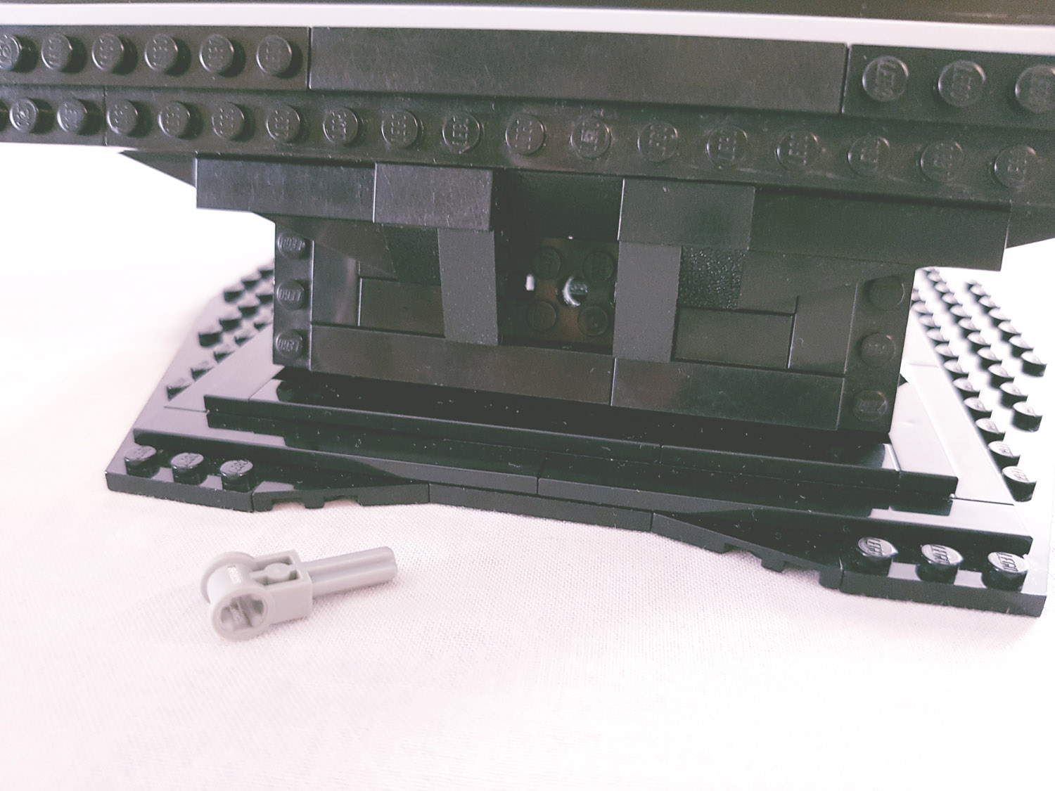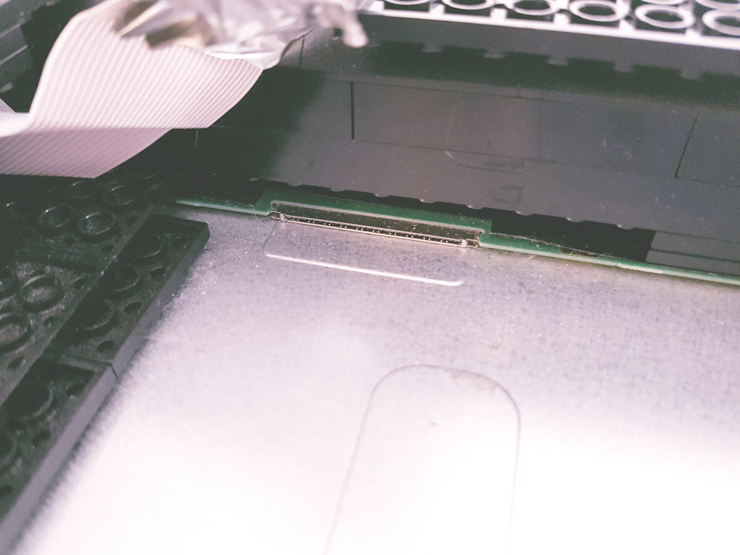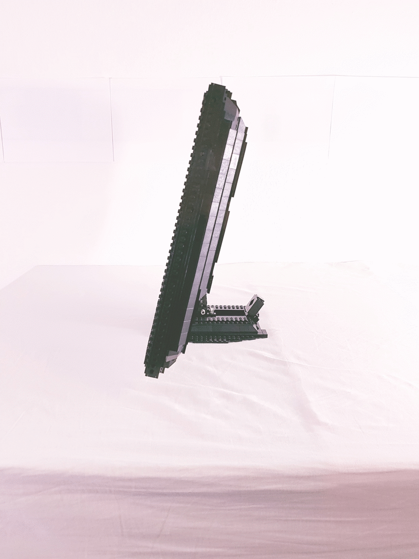 LM Screen ist ein funktionierender Bildschirm in einem Gehäuse aus LEGO Steinen. Er basiert auf einem alten 24″ LCD-Monitor von Acer, dessen Kunststoffgehäuse nach einem Sturz eingerissen war. Der Bildschirm kann in Höhe und Neigungswinkel verstellt werden. Zum Verstellen der Höhe, wird er auf einer gelochten Schiene nach oben oder unten geschoben und mit einem kleinen Bolzen in seiner Position gehalten. Zum Verstellen der Neigung wird eine Stützstange auf einer, ebenfalls gelochten, horizontalen Schiene verschoben und genauso mit einem kleinen Bolzen fixiert. Die OSD-Tasten werden durch Drücken auf kleine LEGO Stangen betätigt und die Status-LED leuchtet durch einen transparenten Stein. Die Anschlüsse, die sich am originalen Bildschirm noch auf der rechten und linken Seite befanden, wurden beim LEGO Monitor in die Mitte gelegt um sie weniger auffällig, hinter dem Standfuß verlaufen zu lassen. Hinten am Standfuß ist außerdem eine Kabelführung verbaut. Um den Stromanschluss zu verlegen, wurde ein Verlängerungskabel verwendet. Durch das schwere Netzteil auf der rechten Seite, musste auf der linken Seite ein Gewicht verbaut werden, um einen gleichmäßigen horizontalen Stand des Bildschirms zu ermöglichen.