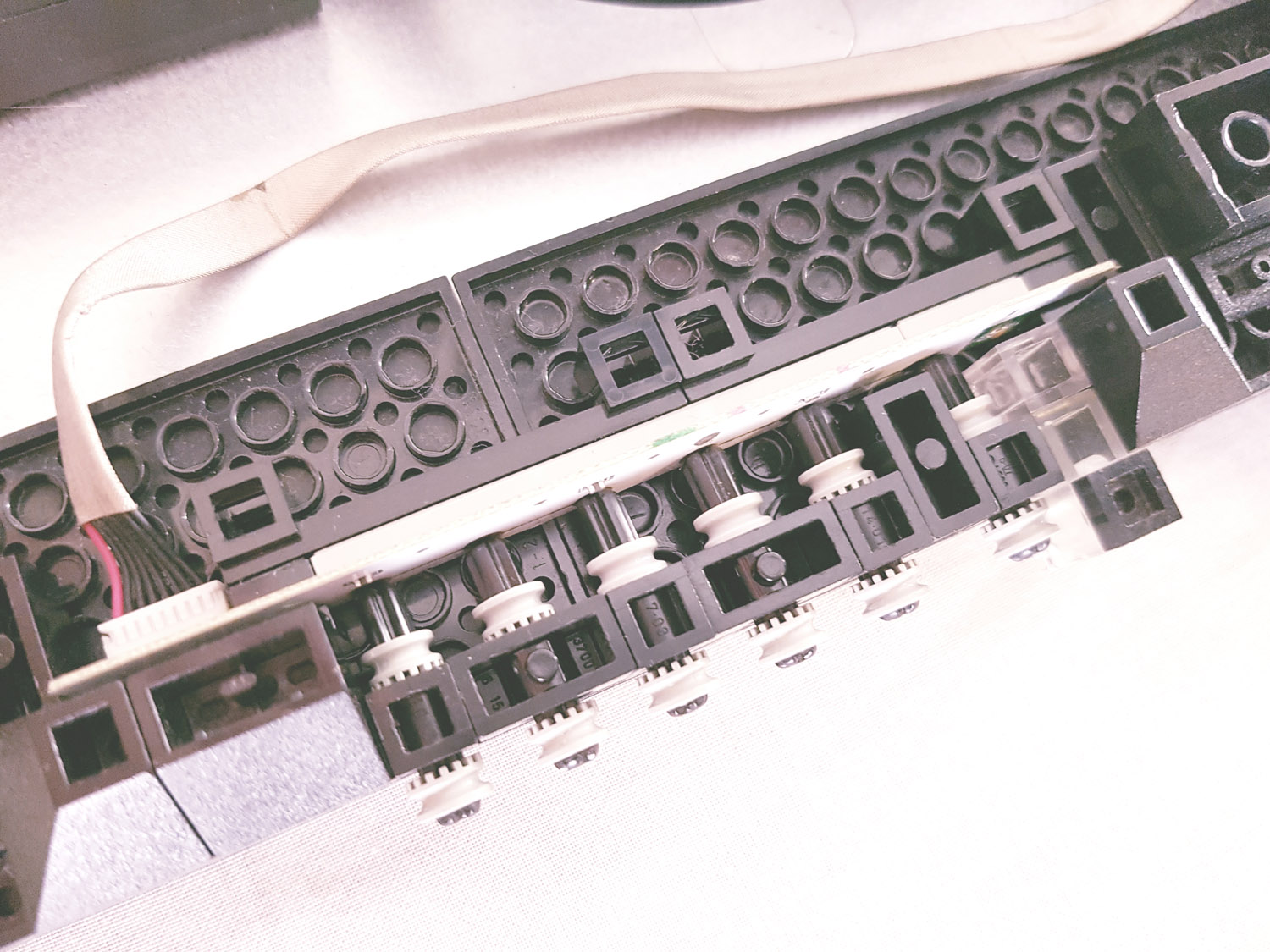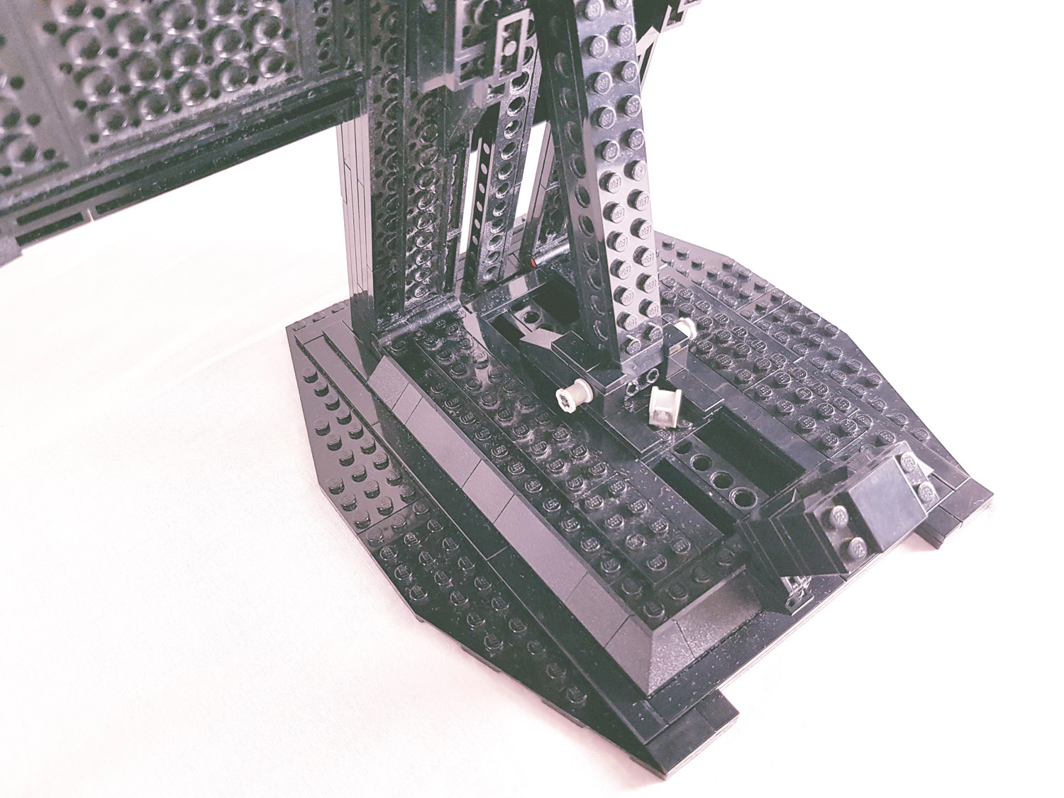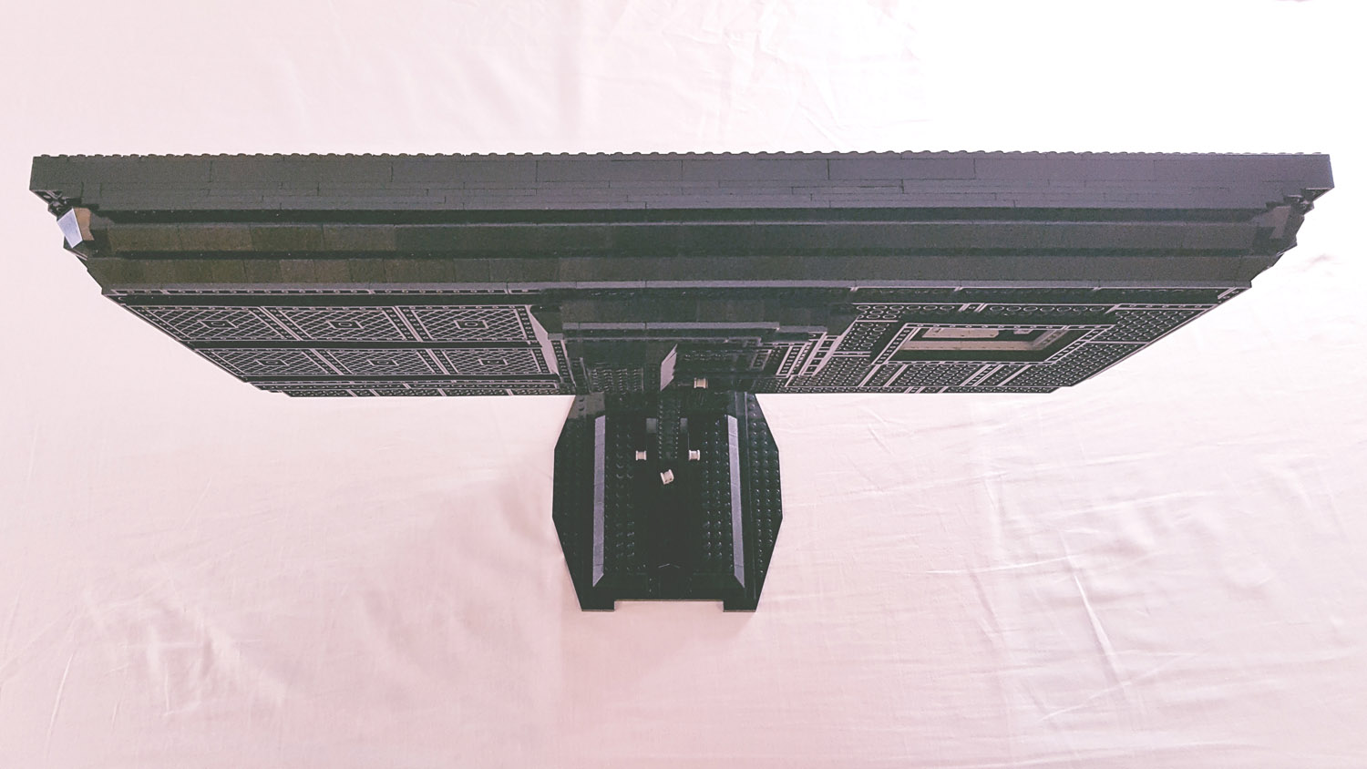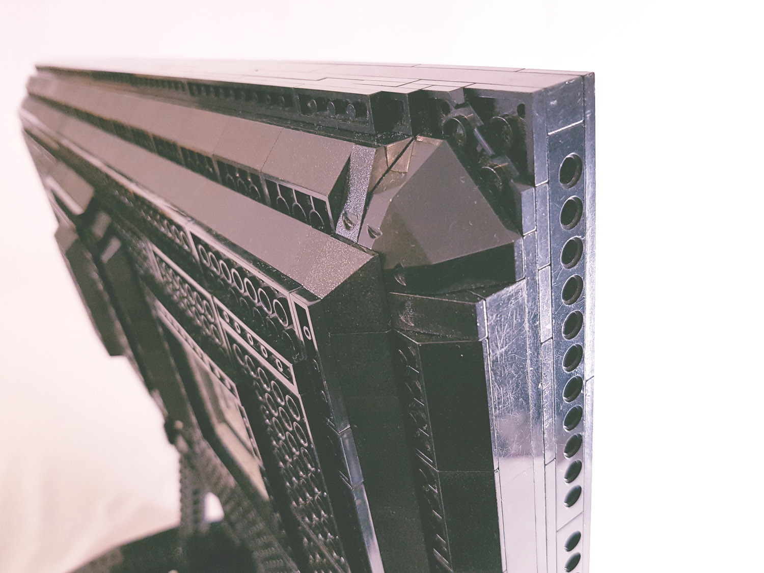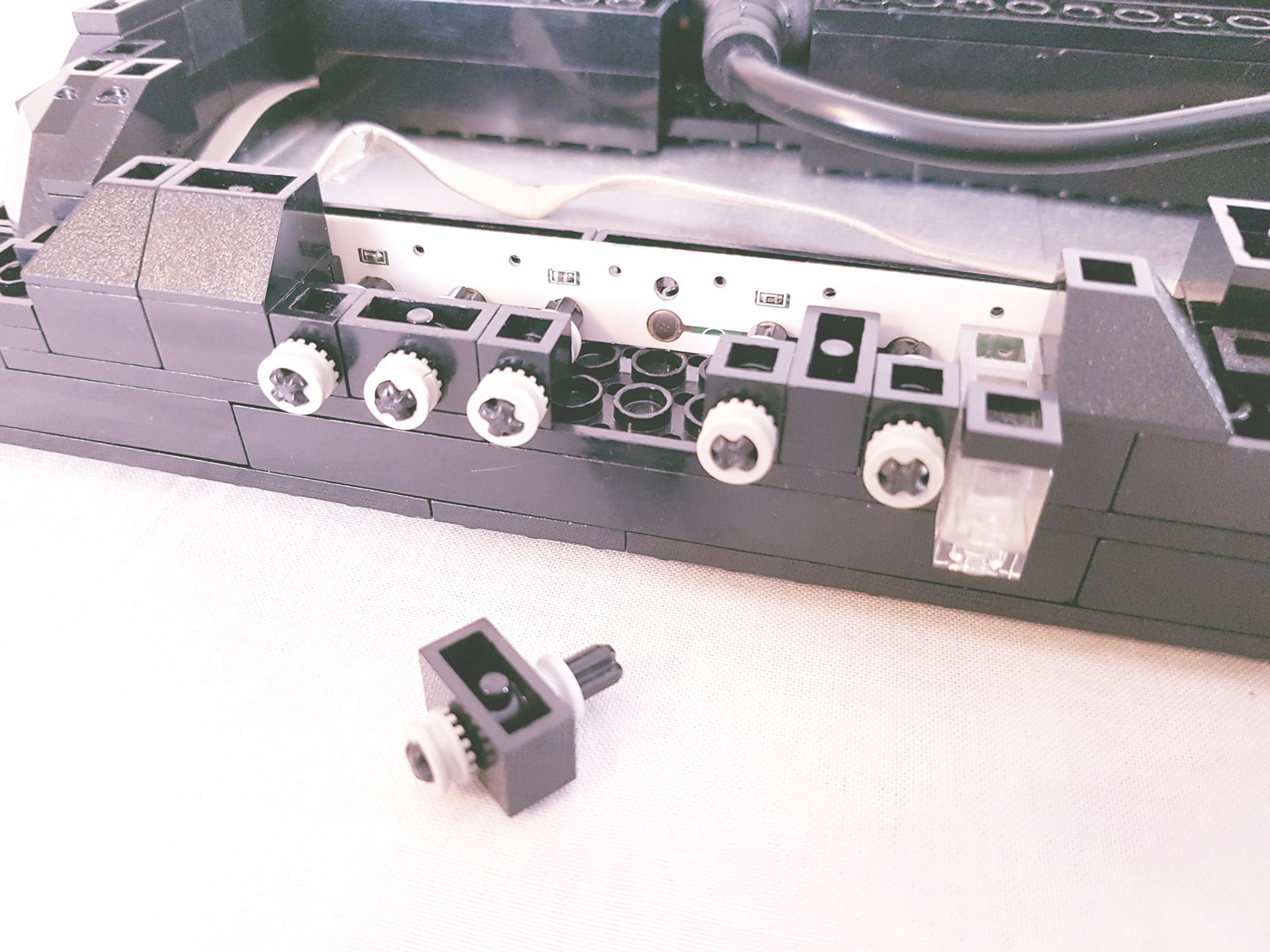 LM Screen ist ein funktionierender Bildschirm in einem Gehäuse aus LEGO Steinen. Er basiert auf einem alten 24″ LCD-Monitor von Acer, dessen Kunststoffgehäuse nach einem Sturz eingerissen war. Der Bildschirm kann in Höhe und Neigungswinkel verstellt werden. Zum Verstellen der Höhe, wird er auf einer gelochten Schiene nach oben oder unten geschoben und mit einem kleinen Bolzen in seiner Position gehalten. Zum Verstellen der Neigung wird eine Stützstange auf einer, ebenfalls gelochten, horizontalen Schiene verschoben und genauso mit einem kleinen Bolzen fixiert. Die OSD-Tasten werden durch Drücken auf kleine LEGO Stangen betätigt und die Status-LED leuchtet durch einen transparenten Stein. Die Anschlüsse, die sich am originalen Bildschirm noch auf der rechten und linken Seite befanden, wurden beim LEGO Monitor in die Mitte gelegt um sie weniger auffällig, hinter dem Standfuß verlaufen zu lassen. Hinten am Standfuß ist außerdem eine Kabelführung verbaut. Um den Stromanschluss zu verlegen, wurde ein Verlängerungskabel verwendet. Durch das schwere Netzteil auf der rechten Seite, musste auf der linken Seite ein Gewicht verbaut werden, um einen gleichmäßigen horizontalen Stand des Bildschirms zu ermöglichen.