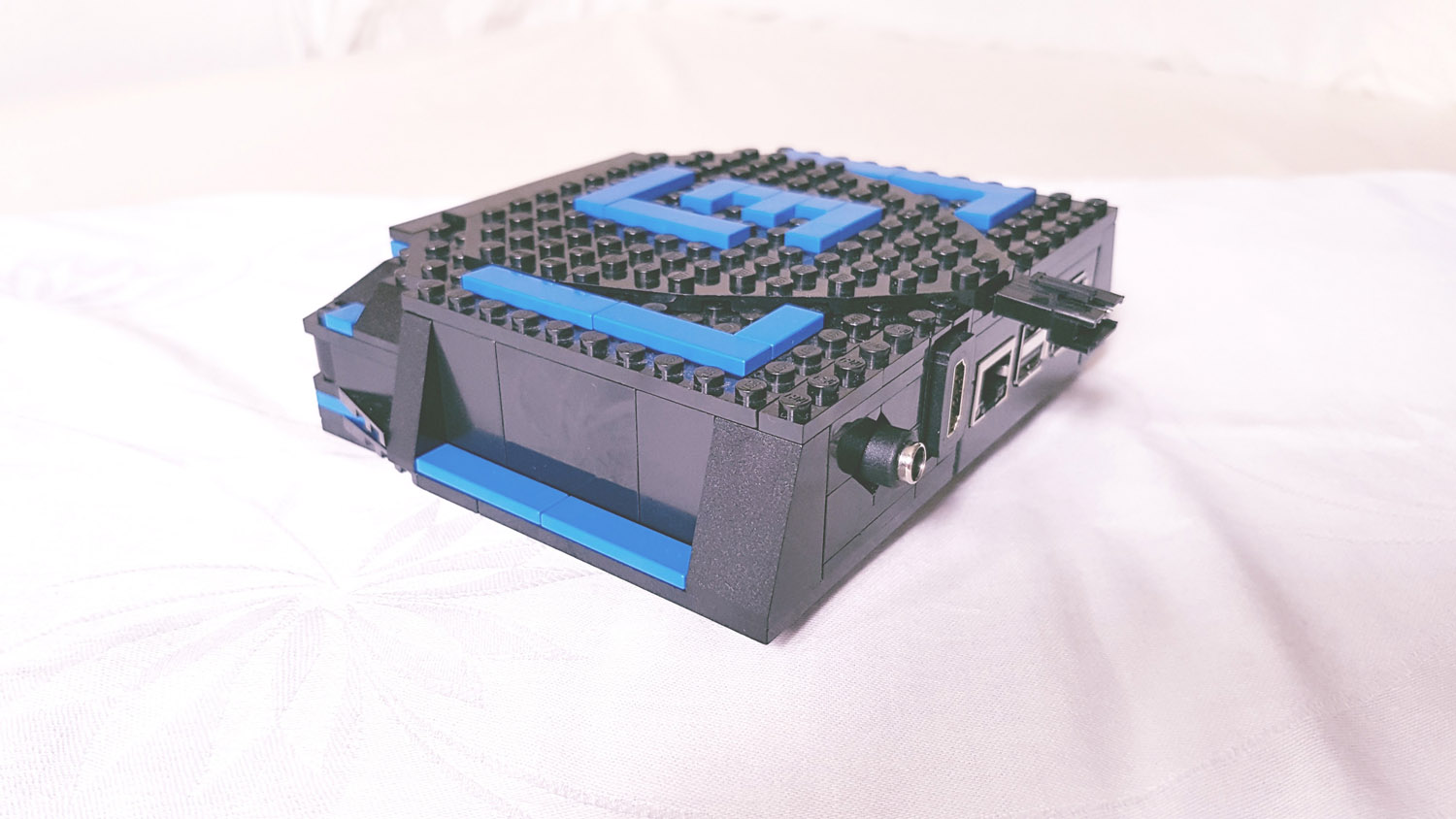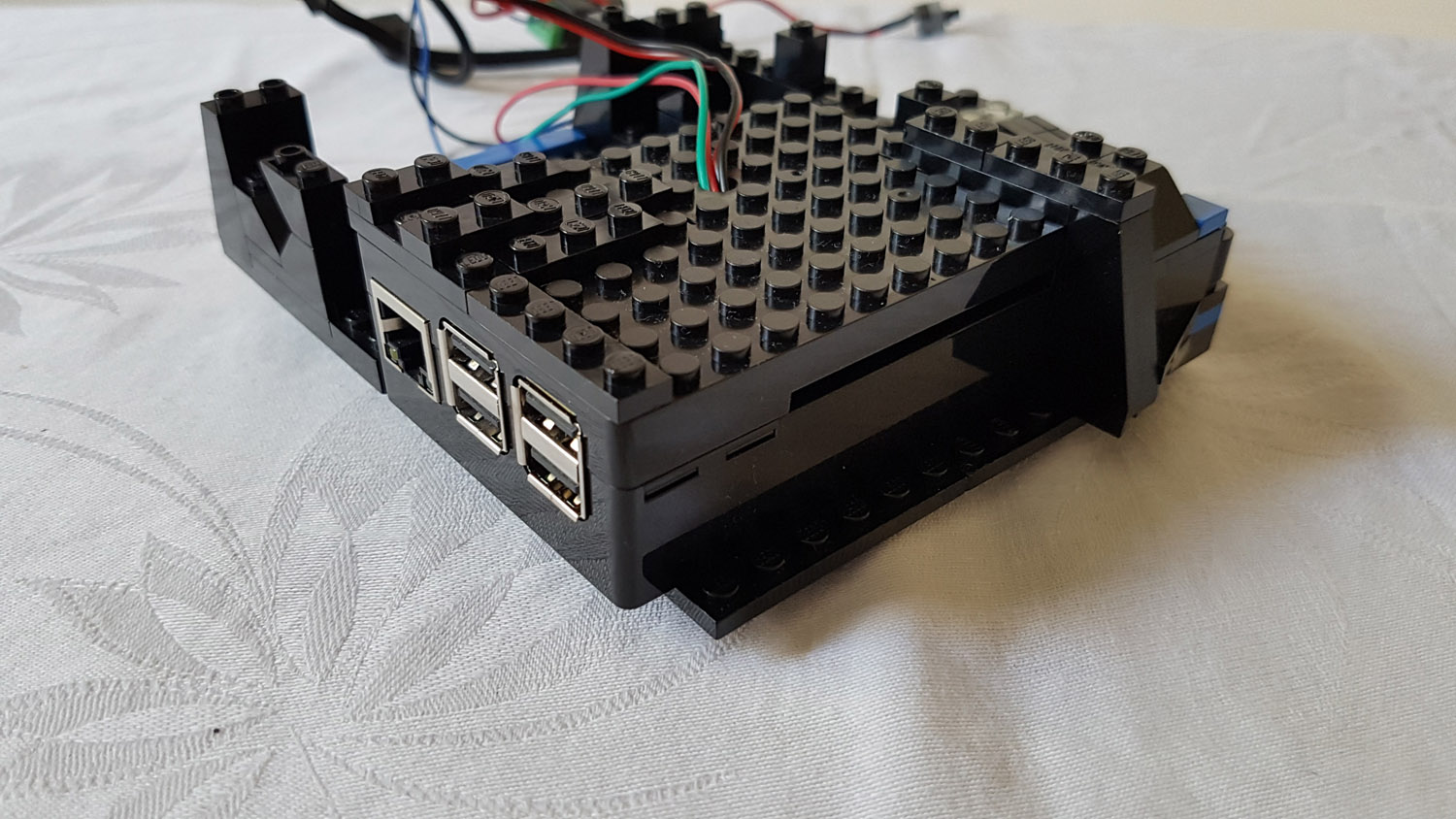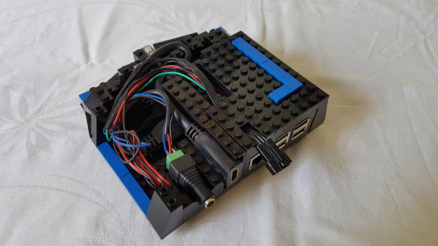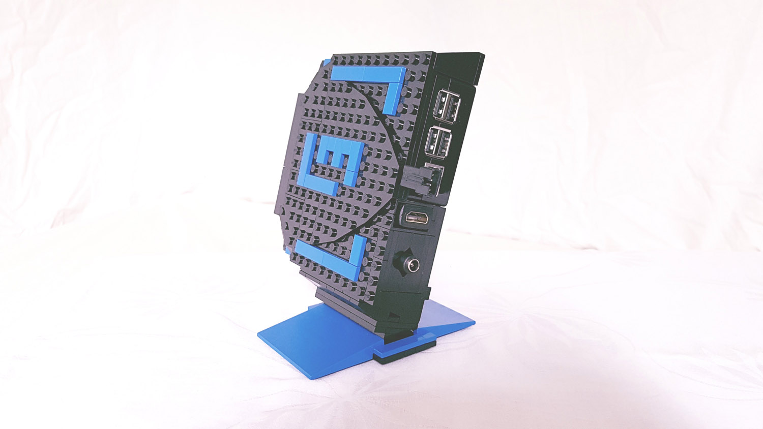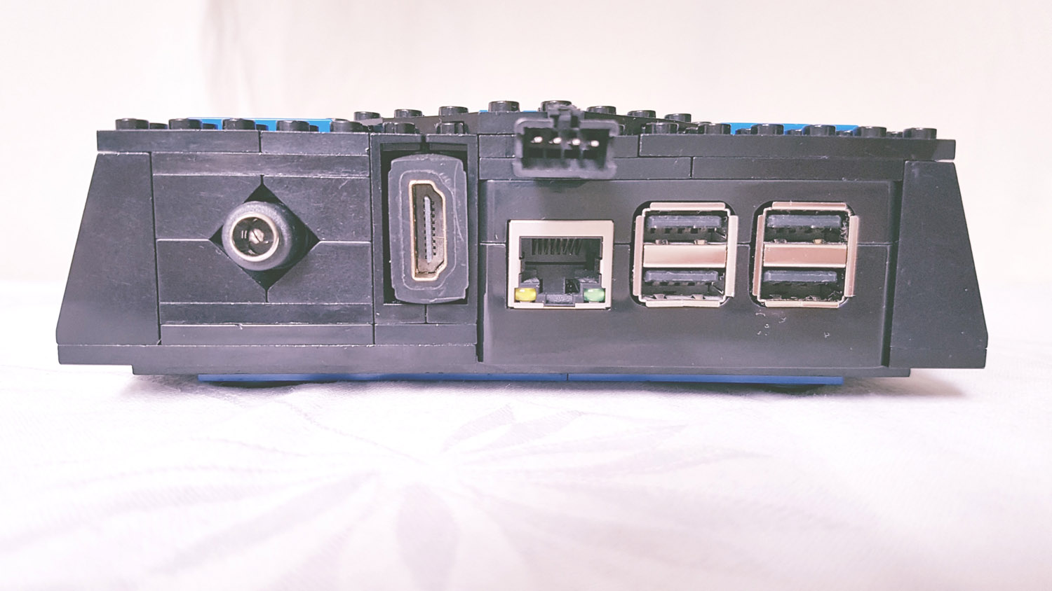 LM v4 basiert auf dem Raspberry Pi 3 Model B, der in dem LEGO-kompatiblen Gehäuse Pi-Blox von Multicomp steckt. Der Raspberry Pi kann mittels OSMC (Kodi) Filme und Serien streamen und LED Streifen über Hyperion als Ambilight ansteuern. Letztere können einfach über den passenden Anschluss auf der Rückseite verbunden werden. Der am Rasperry Pi seitlich gelegene HDMI Anschluss wurde per Verlängerung ebenfalls auf die Rückseite verlegt. An den rückseitigen Stromanschluss, wird ein 5V Netzteil angeschlossen, das Raspberry Pi und die verbundenen LED Streifen versorgen kann. Die Status LEDs des Raspberry Pi, sind durch einen transparenten Stein von außen sichtbar und vorne betätigt das Drücken auf einen Legostein, den Power/Reset Taster.