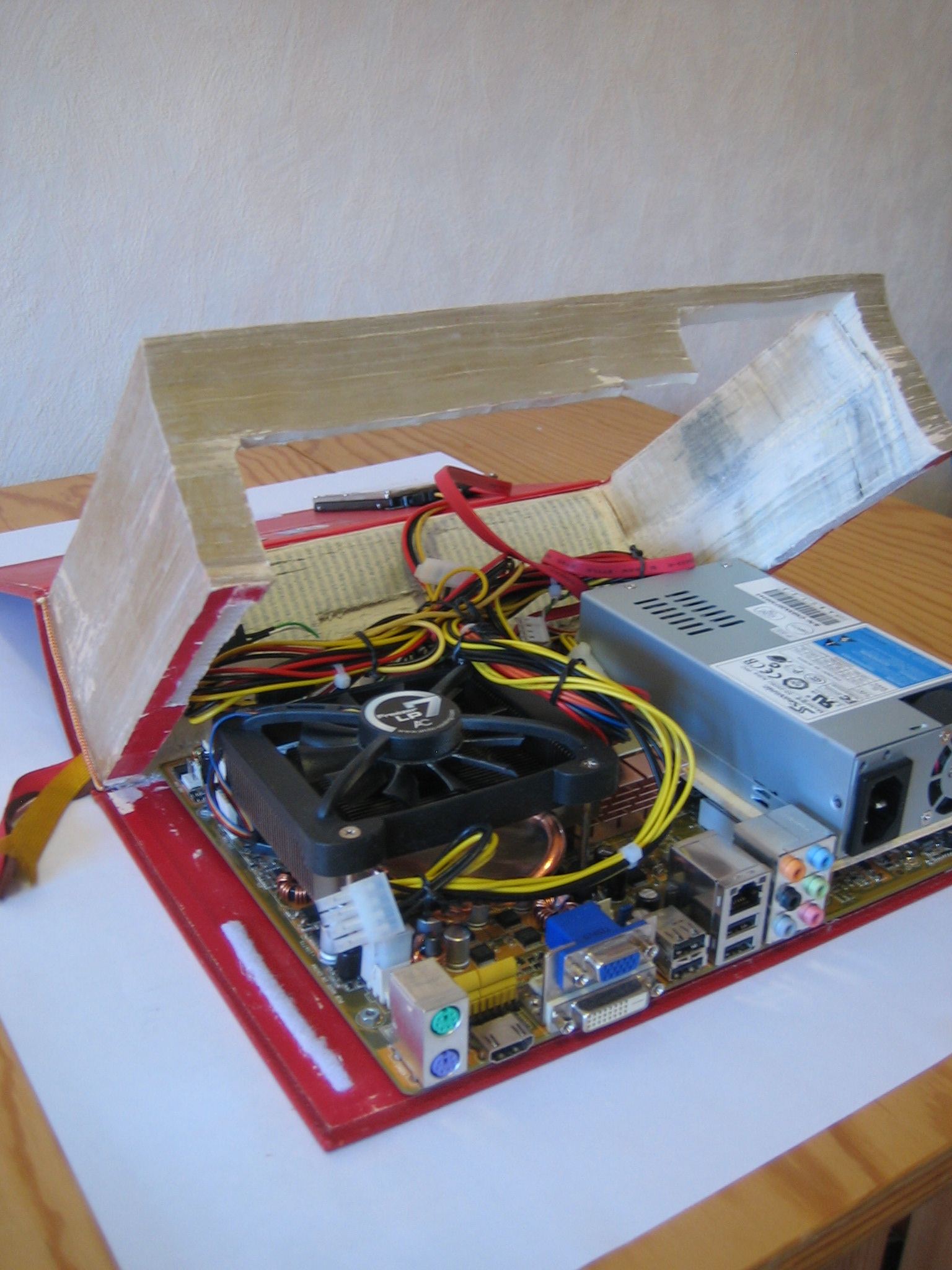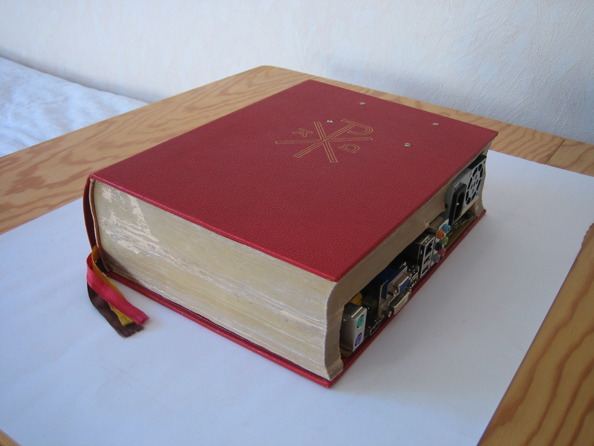 Das Buch, in diesem Fall eine alte Bibel, wurde dazu mit Holzleim verklebt und anschließend ausgehöhlt. Die Hardware Komponenten wurden an den Buchdeckeln verschraubt. Das Äußere der Bibel wurde bewusst unverändert gelassen, so dass zunächst der Anschein eines normalen Buches erweckt wird. Schlägt man die Bibel auf, ist anstatt beschriebener Seiten dann die PC-Hardware zu sehen. Zum Einschalten drückt man einfach auf den seitlichen Bucheinband.