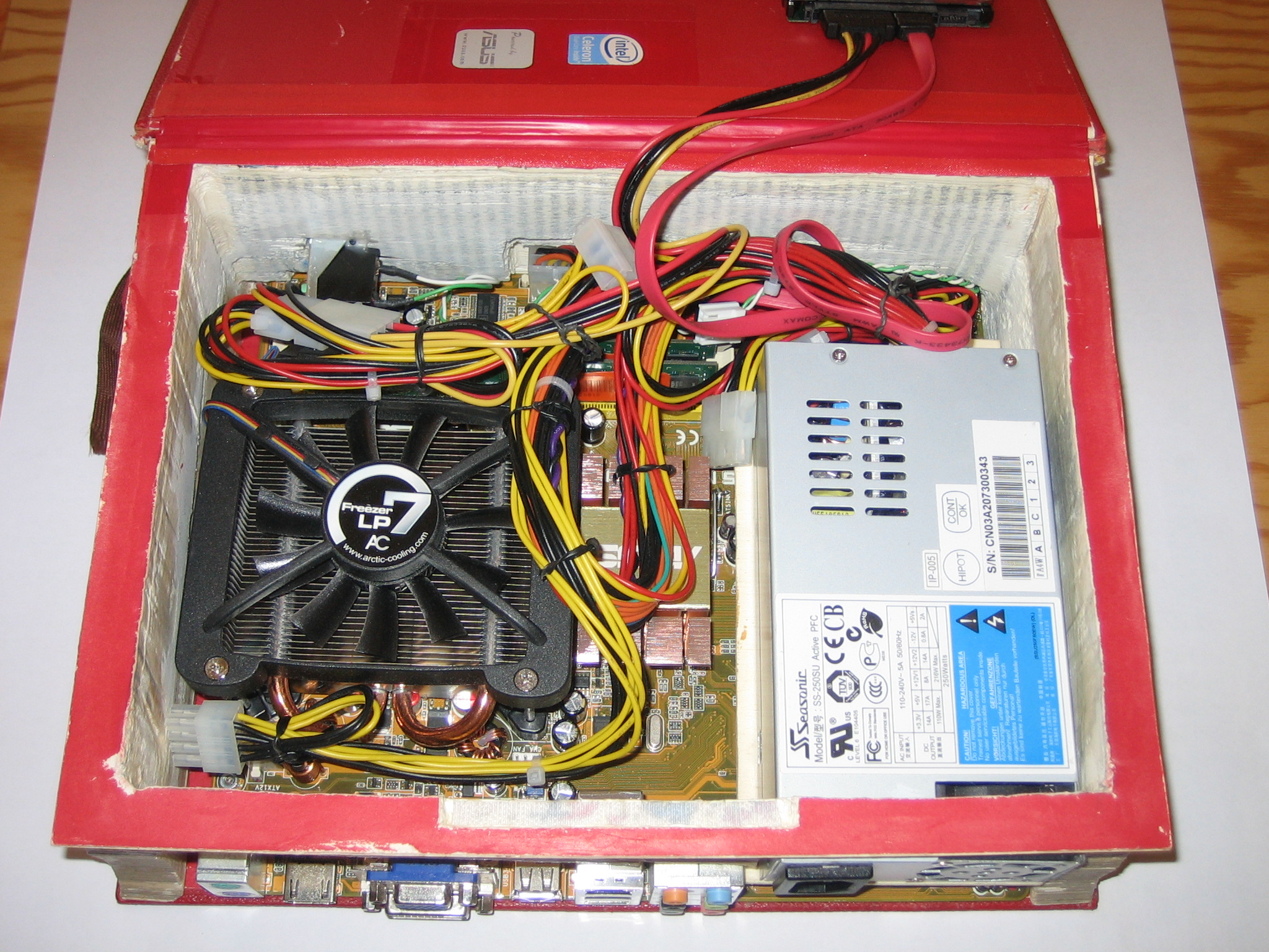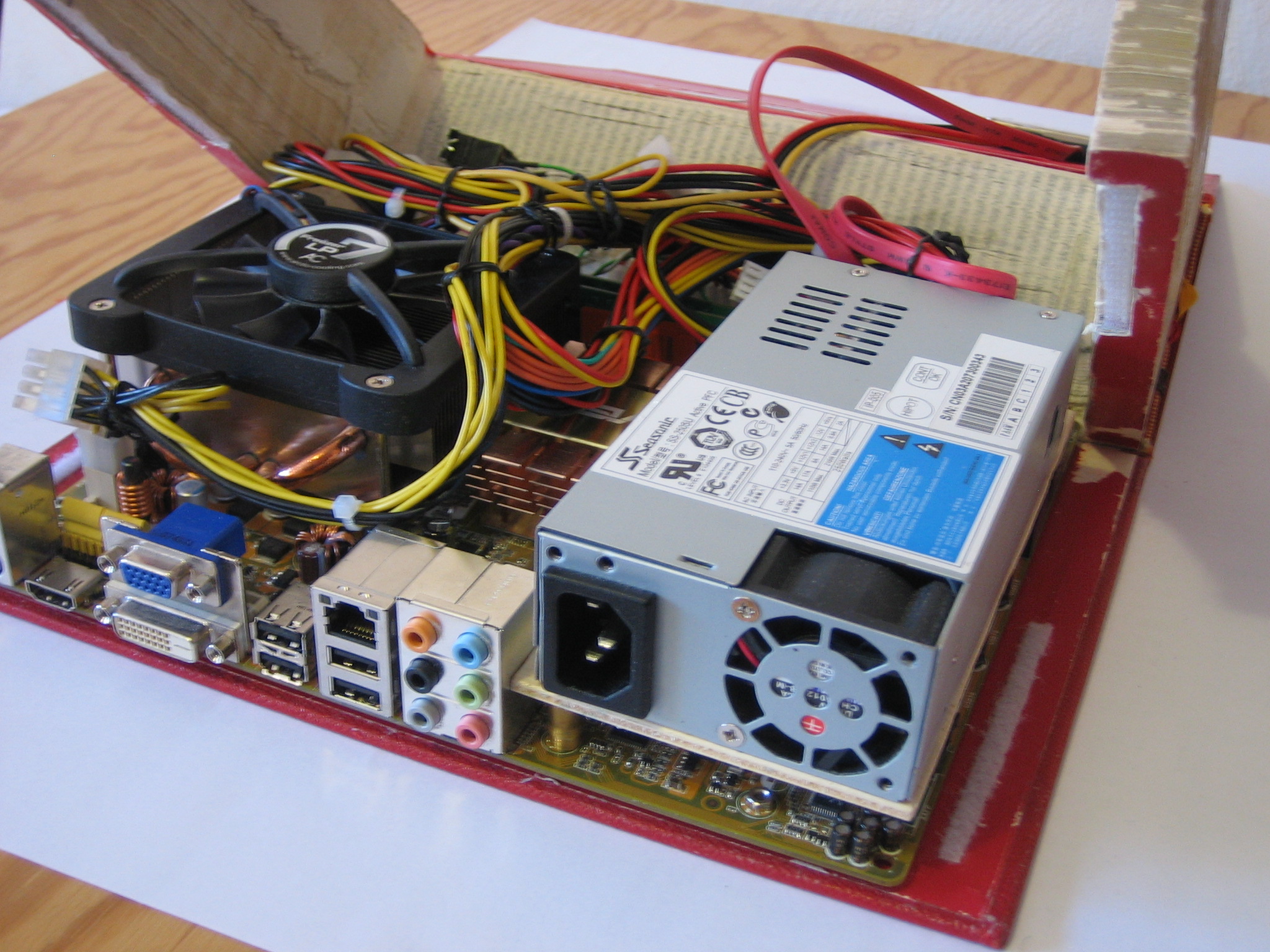 Der Rechner basiert auf einem Mainboard im Micro-ATX Format mit Sockel 775 für Intel Prozessoren. Das Netzteil ist eigentlich für Rackmount Servergehäuse gedacht und ist dadurch mit einer Höhe von 1 HE schmal genug um es verbauen zu können. Beim CPU-Kühler handelt es sich ebenfalls um ein Modell, das für besonders flache Gehäuse konzipiert wurde. Die Festplatte hat das 2,5-Zoll-Format, das üblicherweise auch in Notebooks verbaut wird.